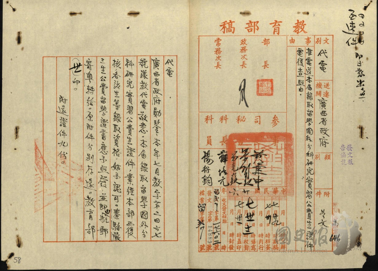 教育部代電廣西省政府有關該部認可本屆錄取留學國外分科研究實習公費生錄取資格並證明證件分別存還