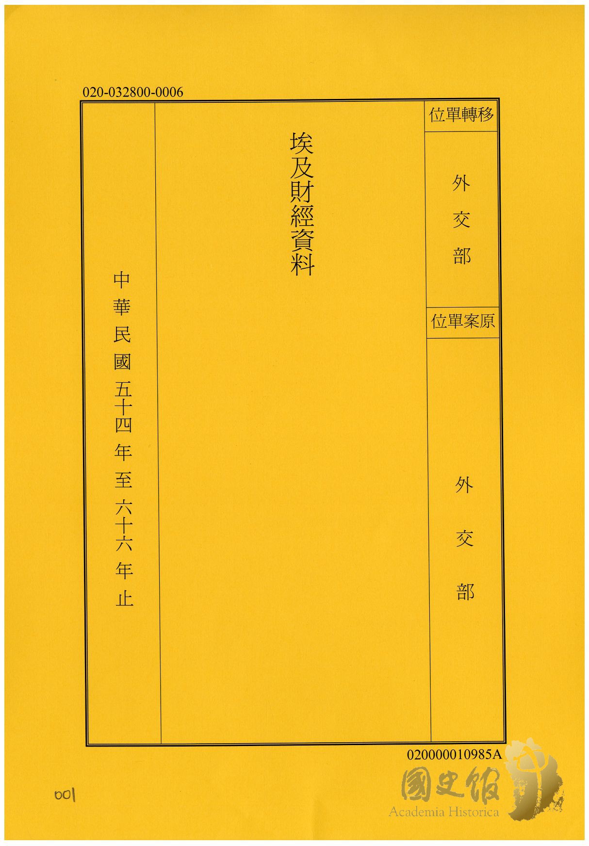 民國五十四年十二月「埃及政府新經濟政策與開闢自由港之檢討」、「埃及新財政計畫」專題報告,外交部亞西司編五十六年八月三十一日「埃報論對西方禁運石油問題」,駐法大使館商務專員處五十六年七月「歐非經濟簡報」第五十五號,經濟部譯「埃及的工業化與技術移轉」等文件