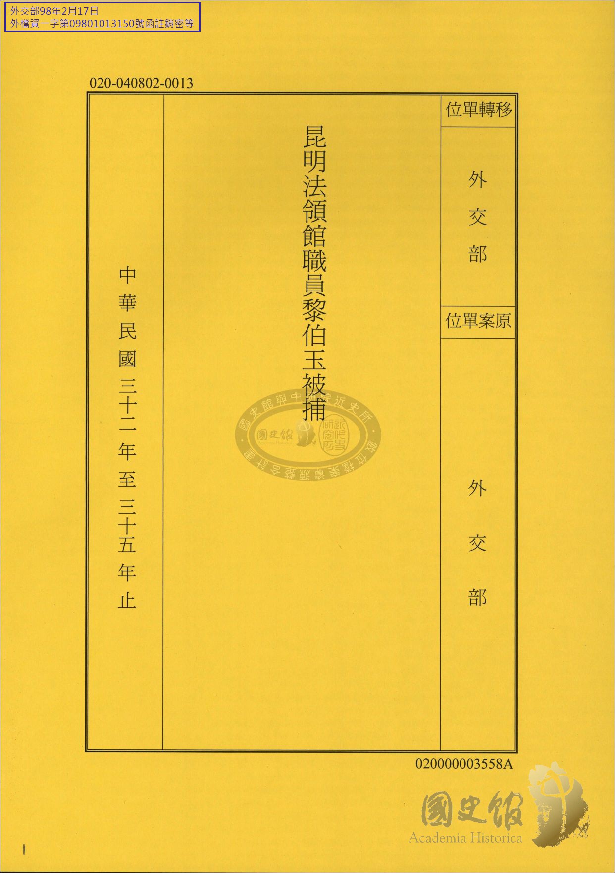憲兵司令部、外交部、駐雲南特派員公署、軍事委員會調查統計局、軍事委員會辦公廳、軍法執行總監部關於法國駐昆明領事館越南籍秘書{#黎伯玉#}為間諜嫌疑被捕暨領館遭竊案法方要求釋放該員、賠償損失並派遣武裝衛隊駐守該館保護事審理經過情形之文電