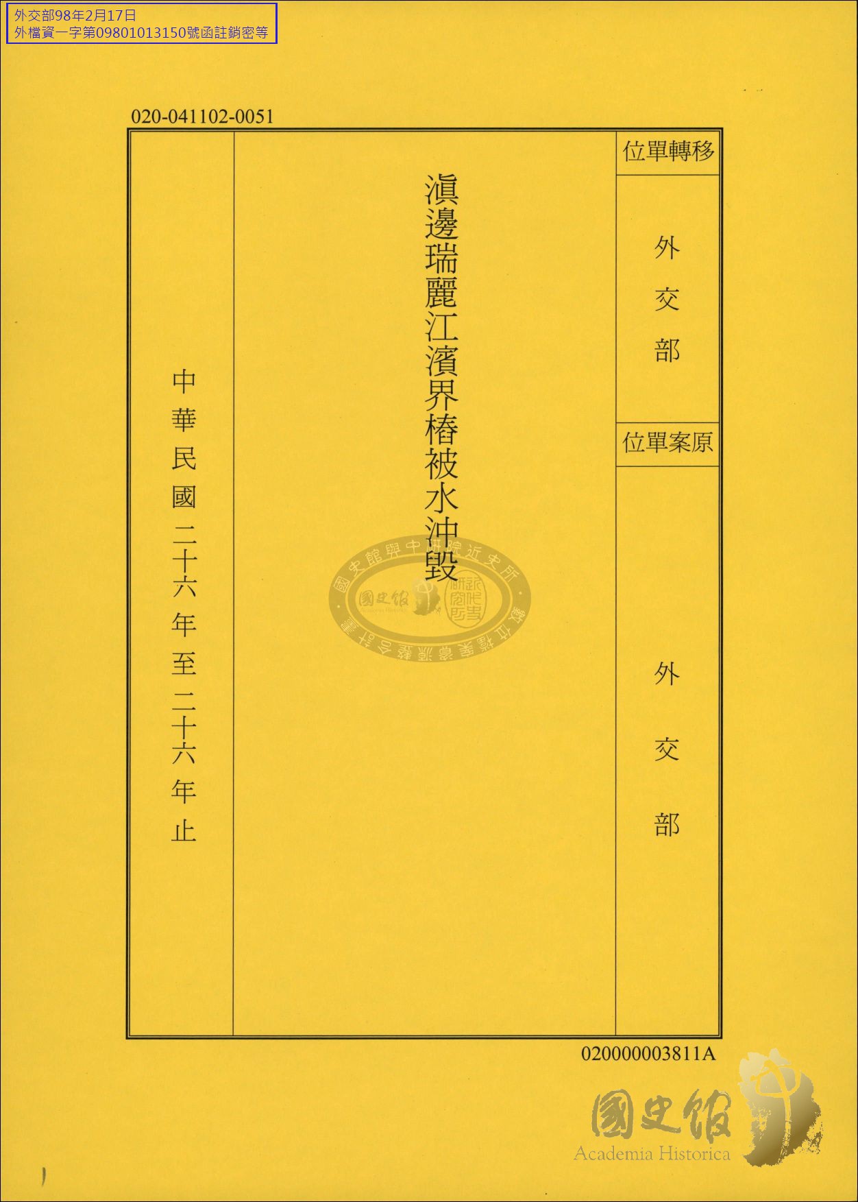 行政院秘書長{#翁文灝#}函外交部檢送英人在滇邊情形報告及有關文件,外交部電雲南省政府主席{#龍雲東#}檢告瑞麗江邊界椿被沖毀事往來函電,外交部駐雲南特派員{#王占祺#}呈外交部部長{#王寵惠#}呈報瑞麗設治局長與緬甸貴概聽修理第四十四號界椿情形檢附有關資料