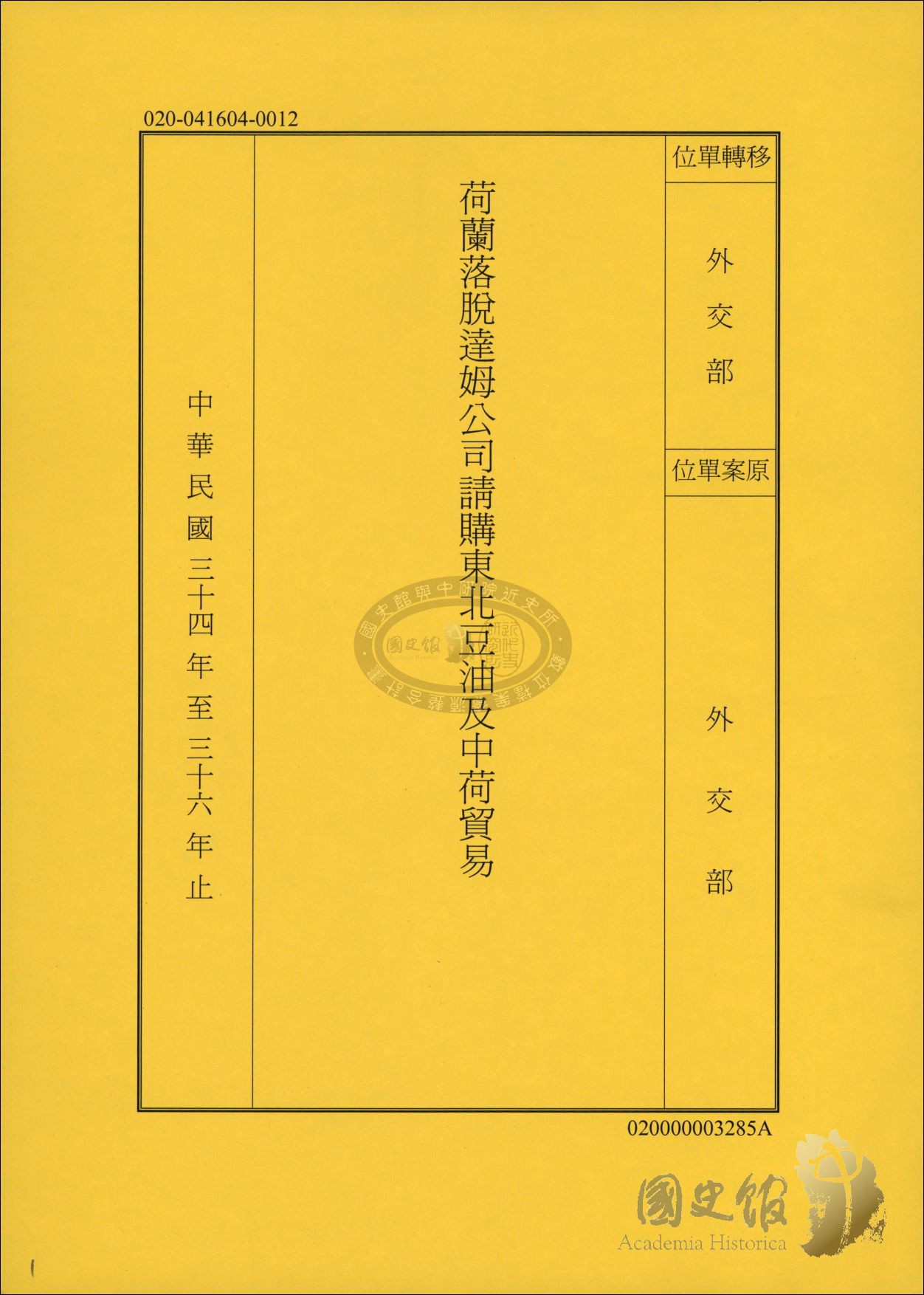 駐荷蘭大使館、外交部、財政部貿易委員會關於荷蘭洛脫達姆G. S. Kievit油脂公司擬輸入東北出產之豆油請惠知東北豆油出產情形及介紹中國進出口貿易機關及中國植物油料廠擬具東北大豆及油餅產銷概要等相關文件,荷蘭駐華大使館、外交部、行政院關於荷蘭政府請運大豆出口、往荷屬東印度運銷由敵方接收之棉布、荷蘭出口商擬承辦椰子油酪輸華事相關文件