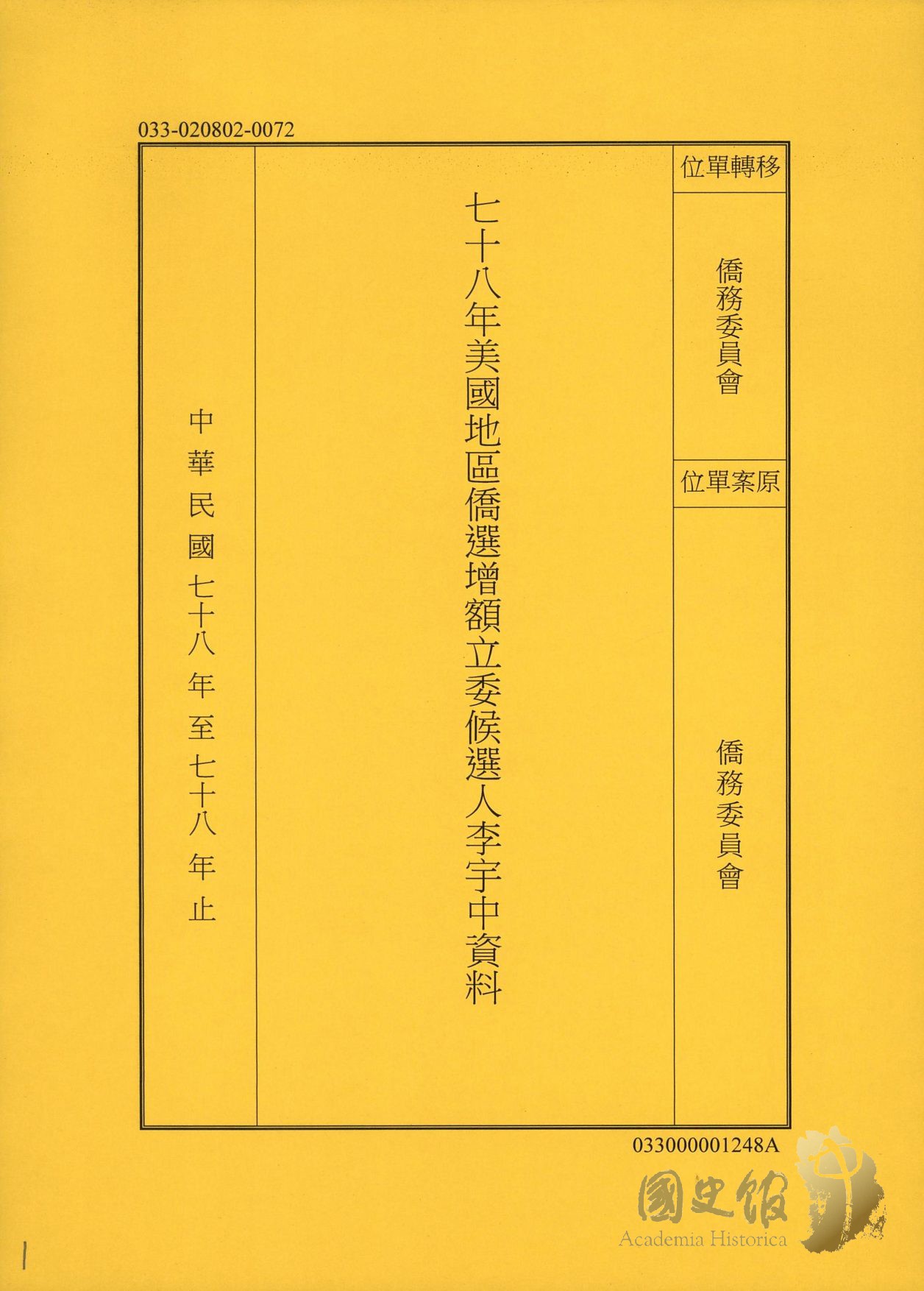 七十八年美國地區僑選增額立委候選人李宇中資料