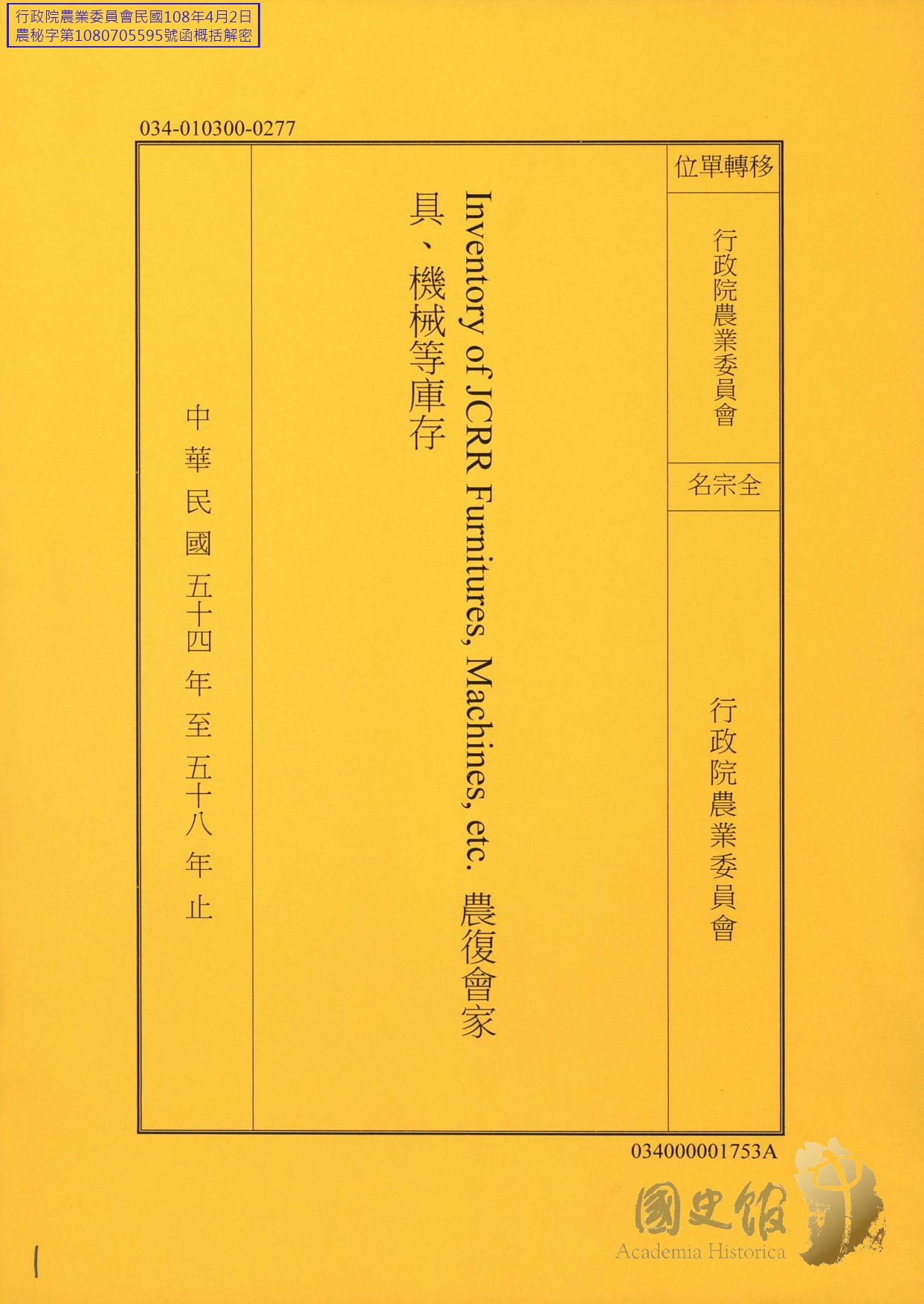 Inventory of JCRR Furnitures, Machines, etc. 農復會家具、機械等庫存
