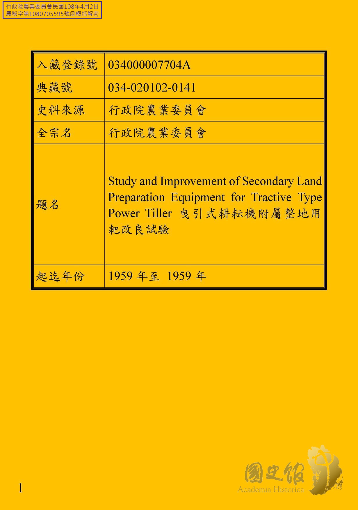 Study and Improvement of Secondary Land Preparation Equipment for Tractive Type Power Tiller 曳引式耕耘機附屬整地用耙改良試驗