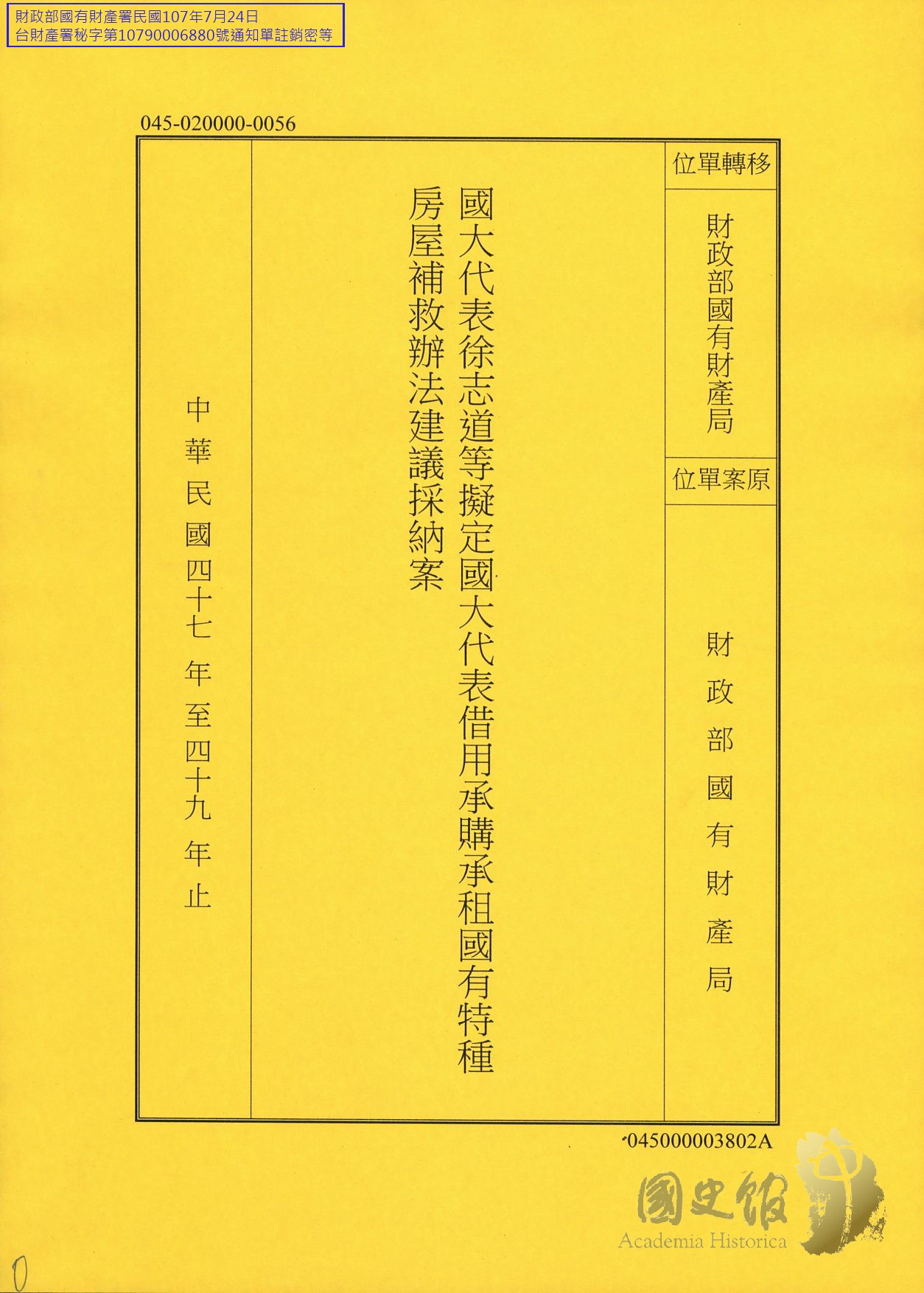 國大代表徐志道等擬定國大代表借用承購承租國有特種房屋補救辦法建議採納案