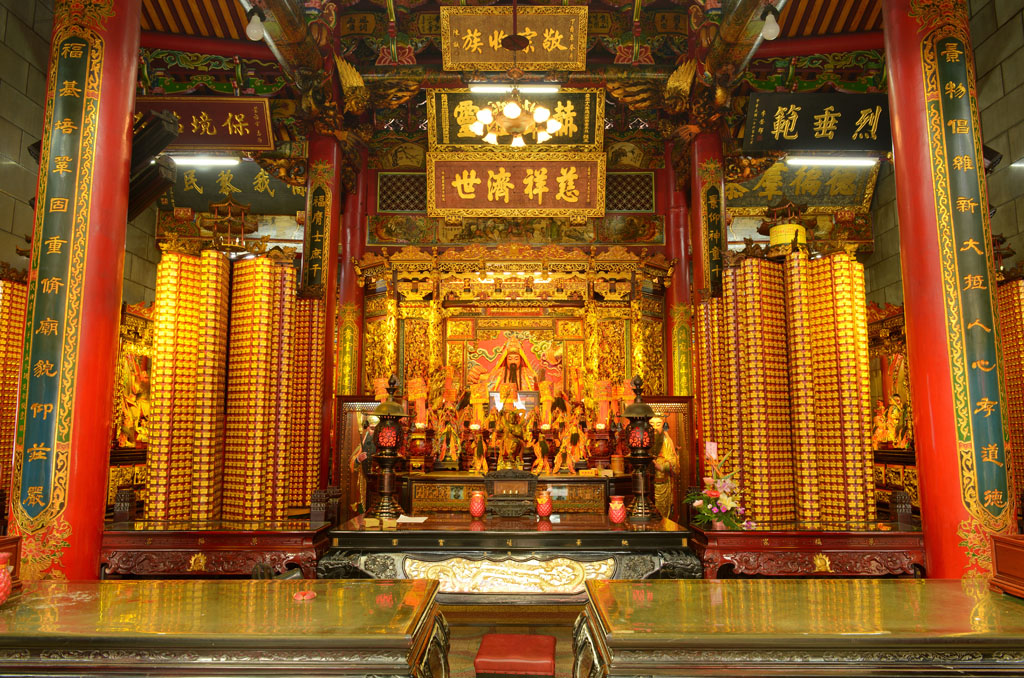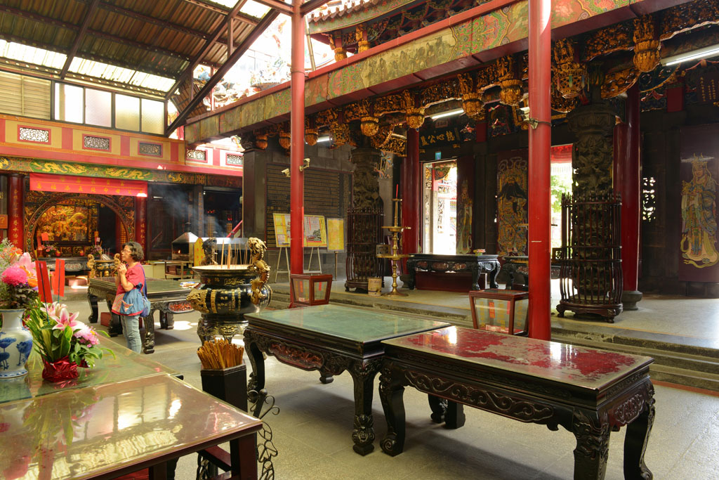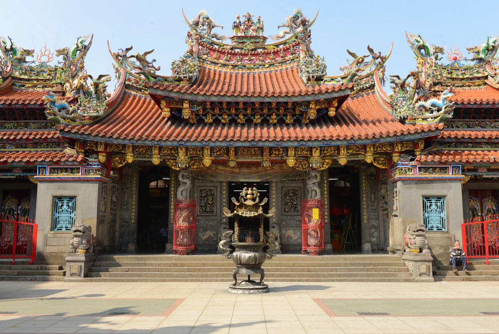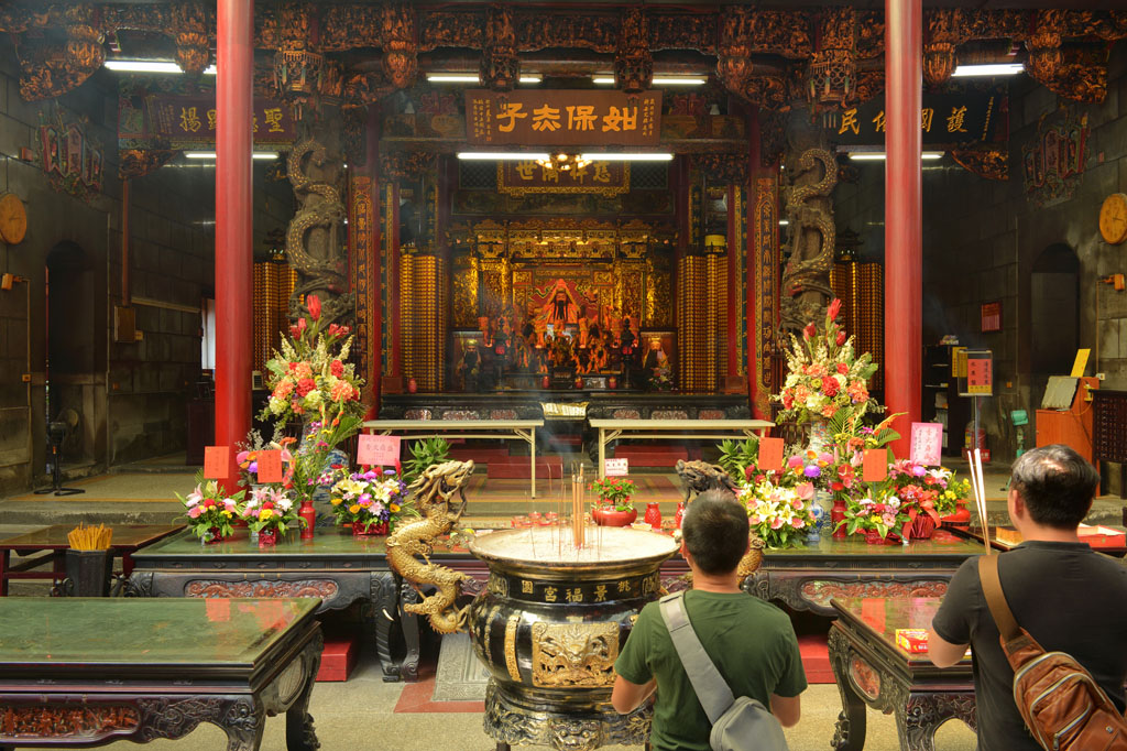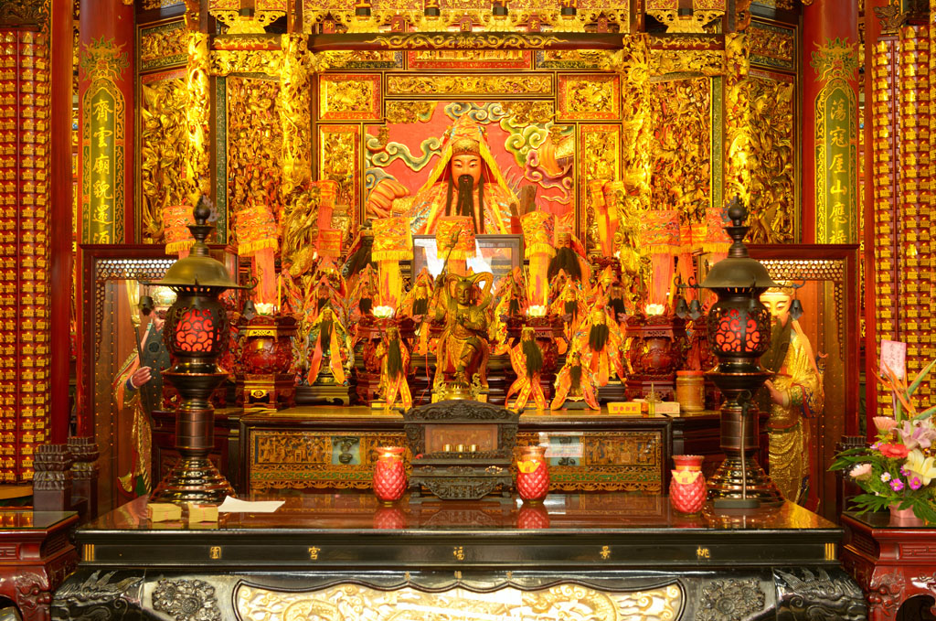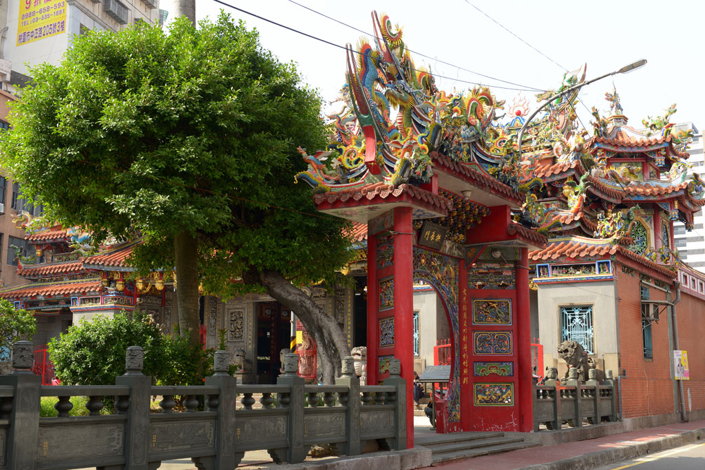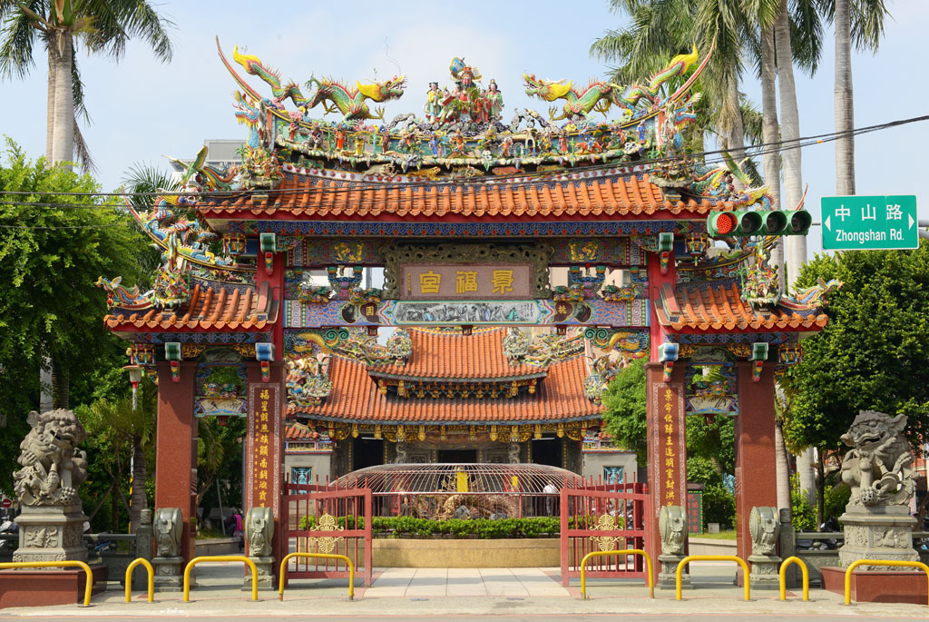 桃園景福宮又稱「聖王廟」,廟貌恢弘,地方上多稱「大廟」,座落桃園區市中心,既是信仰重地,也是古蹟。大廟座北朝南略偏東,是一座面寬九開間兩進兩廊的四合院廟宇建築,從面對中正路的4柱3間牌樓到前殿之間有寬廣前埕,三川殿面寬三開間,正面牆堵多為歷史近百年的石雕作品,正殿寬敞巍峨,內奉漳州人守護神——開漳聖王。