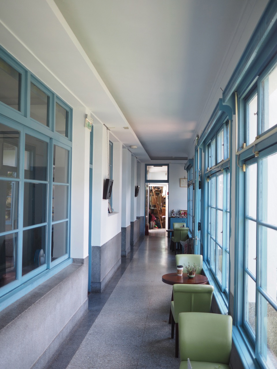 眼前,一扇又一扇漆成藍色的木質門窗饒富儉樸與古意,吸引著人們推開門扉進入其中,館內展示著各種藝術的主題展,長廊上,由一片片木板組合的長條椅,不禁發人思古之幽情。西南側的洗石子涼亭,名為志清亭,據說是當時文人雅士聚集之處,順便遠朓大漢溪的景緻,在在都是知性之旅停泊處。