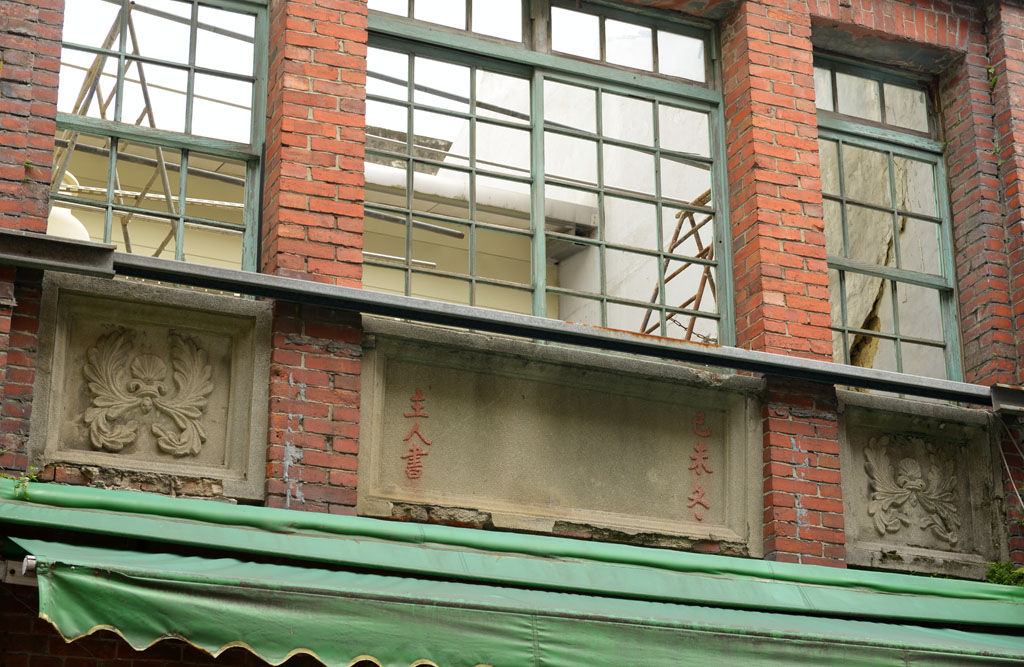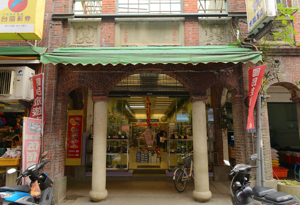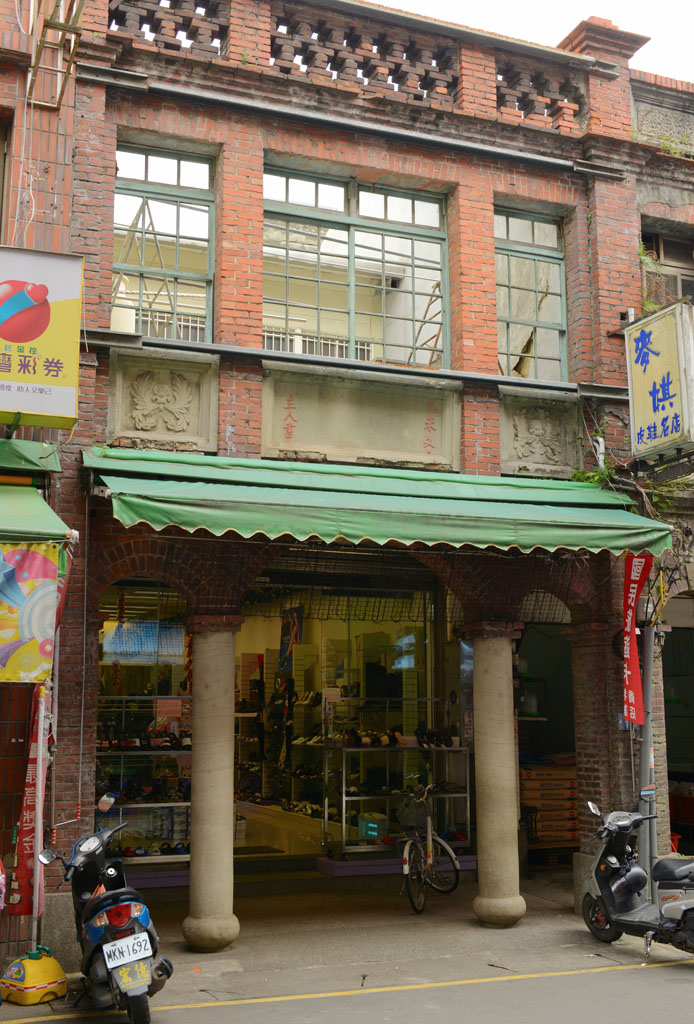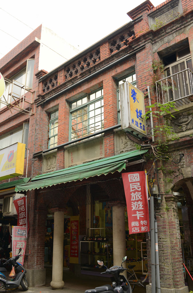 這是大溪老街中少見的兩層樓街屋。大溪老街街屋多往後頭發展,一落、二落、三落地往後加,兩層樓的少見,因台語「樓」、「流」同音,老一輩的說:「財產是靠水流的,樓仔厝驚乎水流去」。或許也因為都是一樓厝,老闆們便花了許多心思在牌樓面上較勁,相較之下這兩層樓的店屋倒顯得樸素許多,然而其紅磚砌的牌樓面仍展現了日治時期大溪街屋的特色。