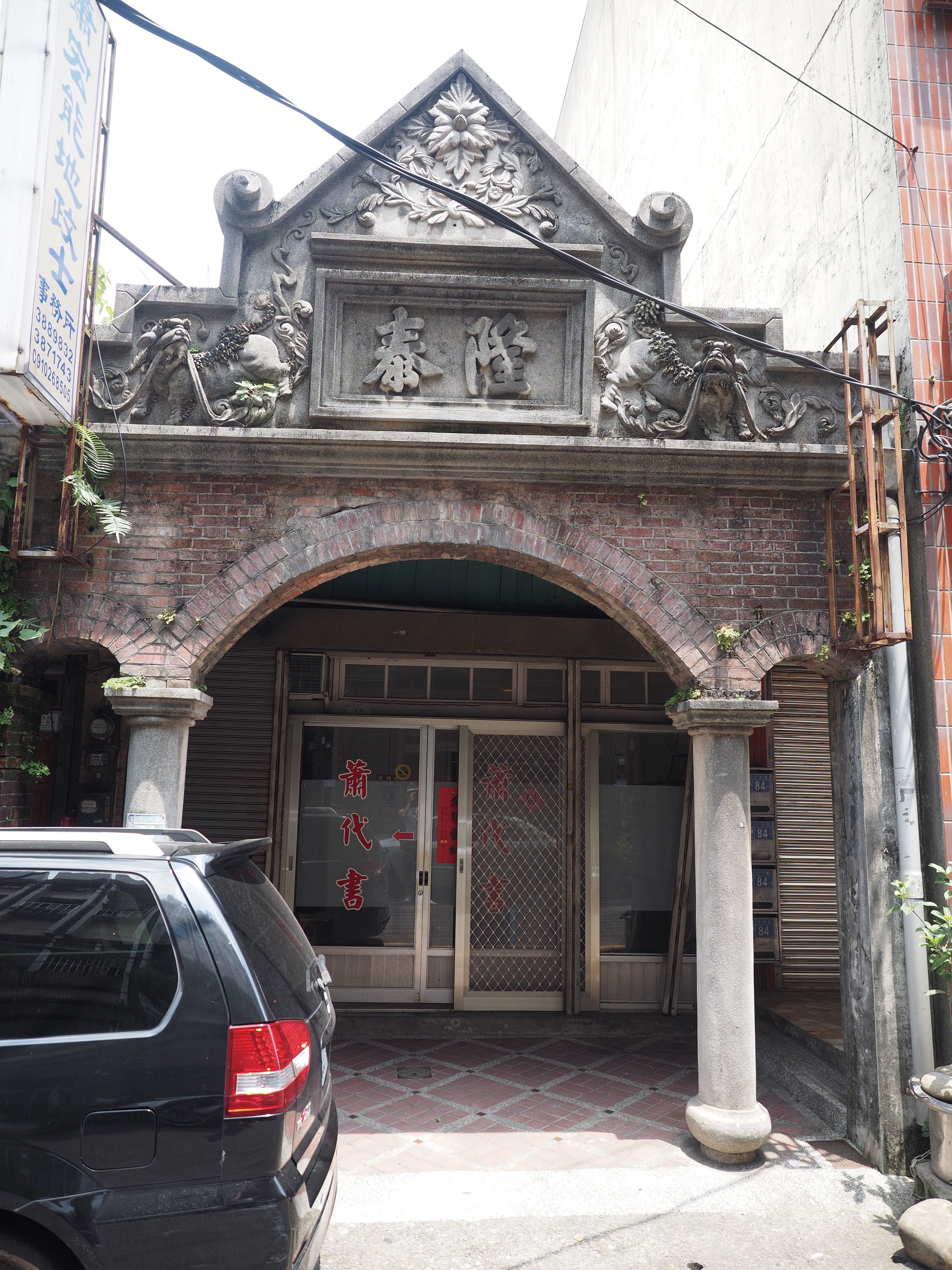 隆泰為大溪蕭家產業,蕭家居住在此有數代之久,曾經營雜貨、布行等生意,其建築格局為四落二過水,頭落為辦公室,二落大廳後的房間由當家夫婦居住,其餘都是住家空間。牌樓立面以清水紅磚砌成三段式圓拱,圓形間柱上為仿多立克柱式,山牆兩側各有一隻小獅口啣綵帶,有「祥獅獻瑞」之意,屬於融合巴洛克、中國傳統動物、花草紋樣的折衷樣式,充分展現西風東漸的時代風格。