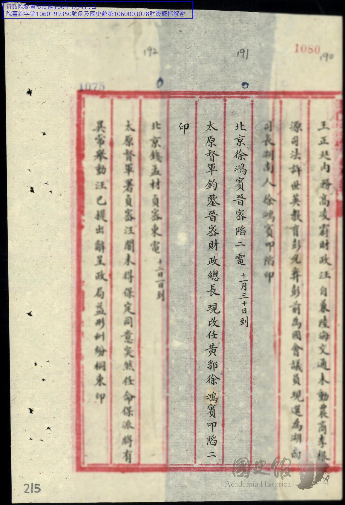 徐鴻賓電閻錫山內閣中財政總長改任黃郛