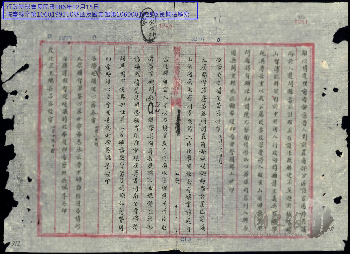 吳佩孚電詢閻錫山關於吳顧問任第三區礦務監督之意見