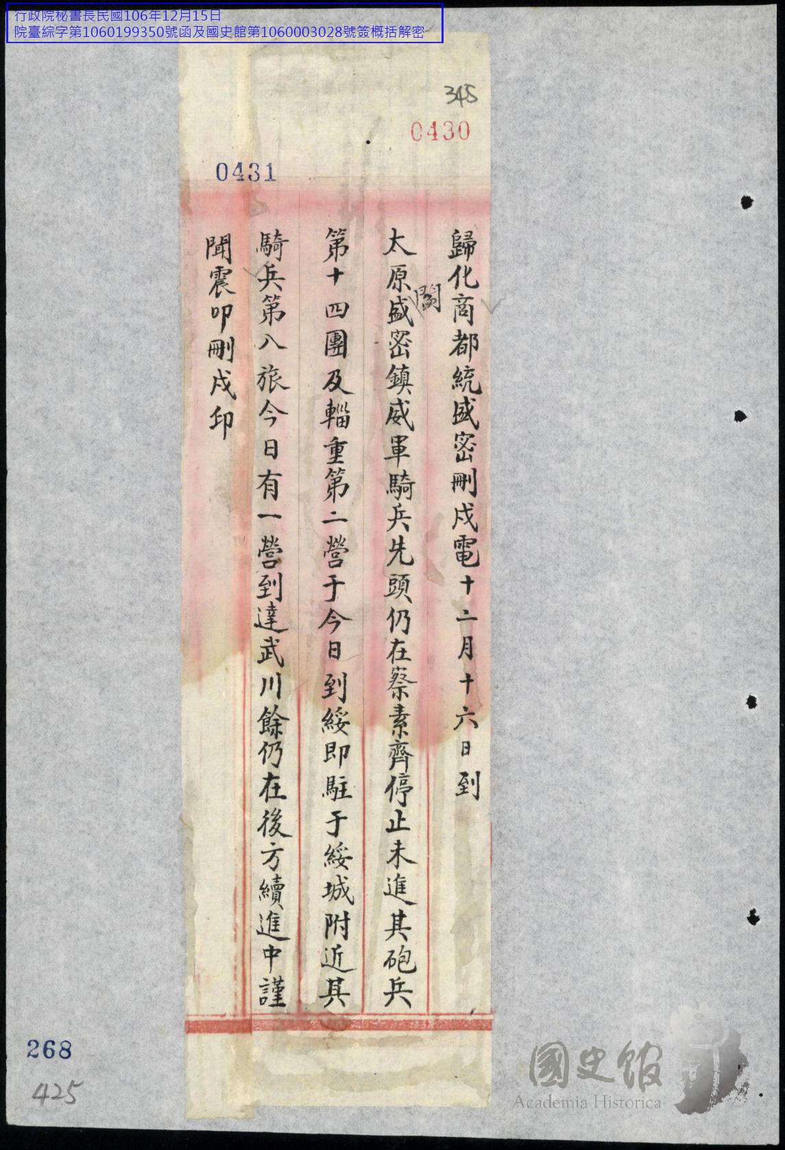 聯軍與國民軍戰役案(六)【原卷名:閻伯川先生要電錄存聯軍與國民軍戰役案清理綏包與馮部退甘】