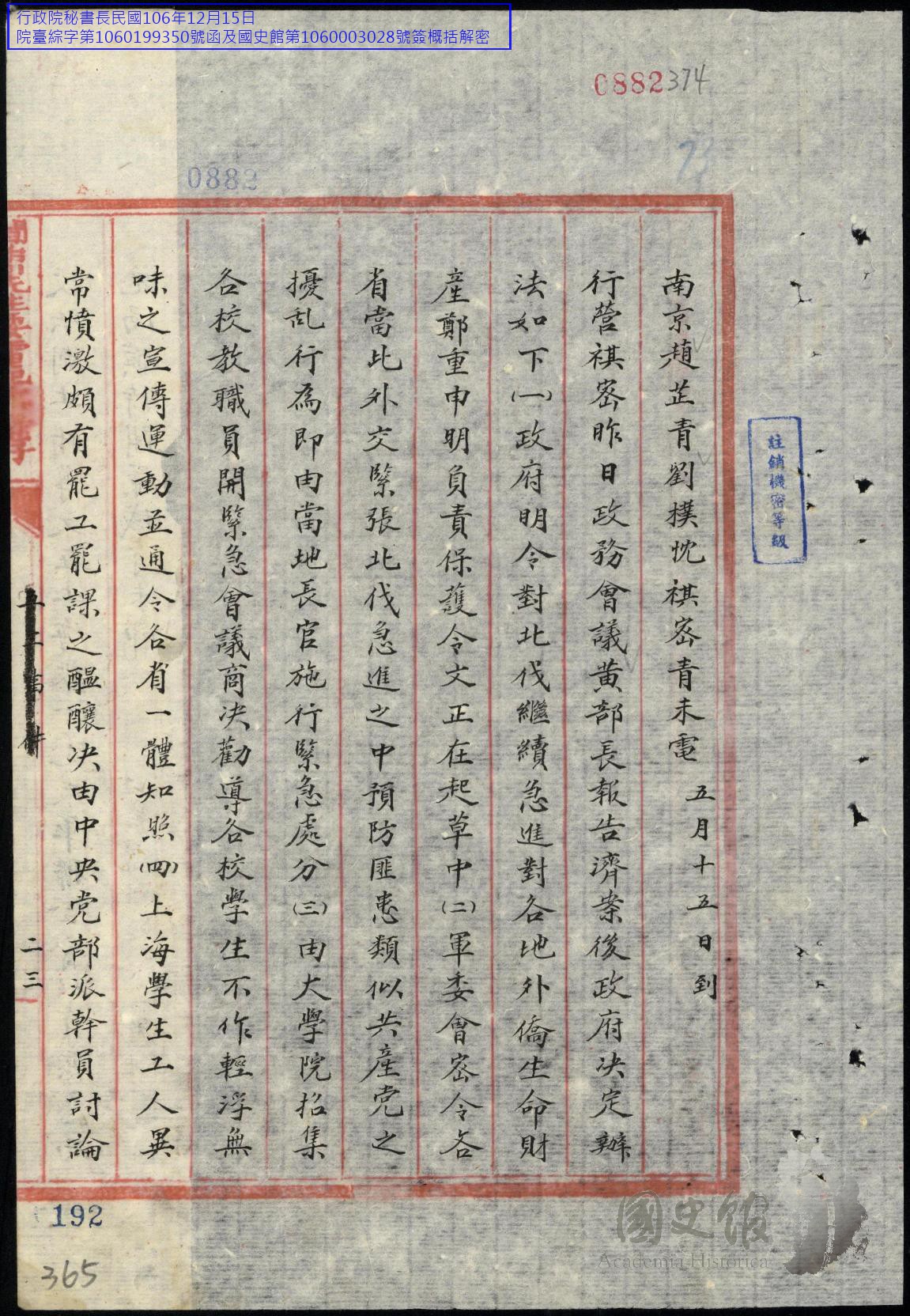 趙丕廉等電閻錫山濟案後政府明令北伐繼續並保護外僑生命財產
