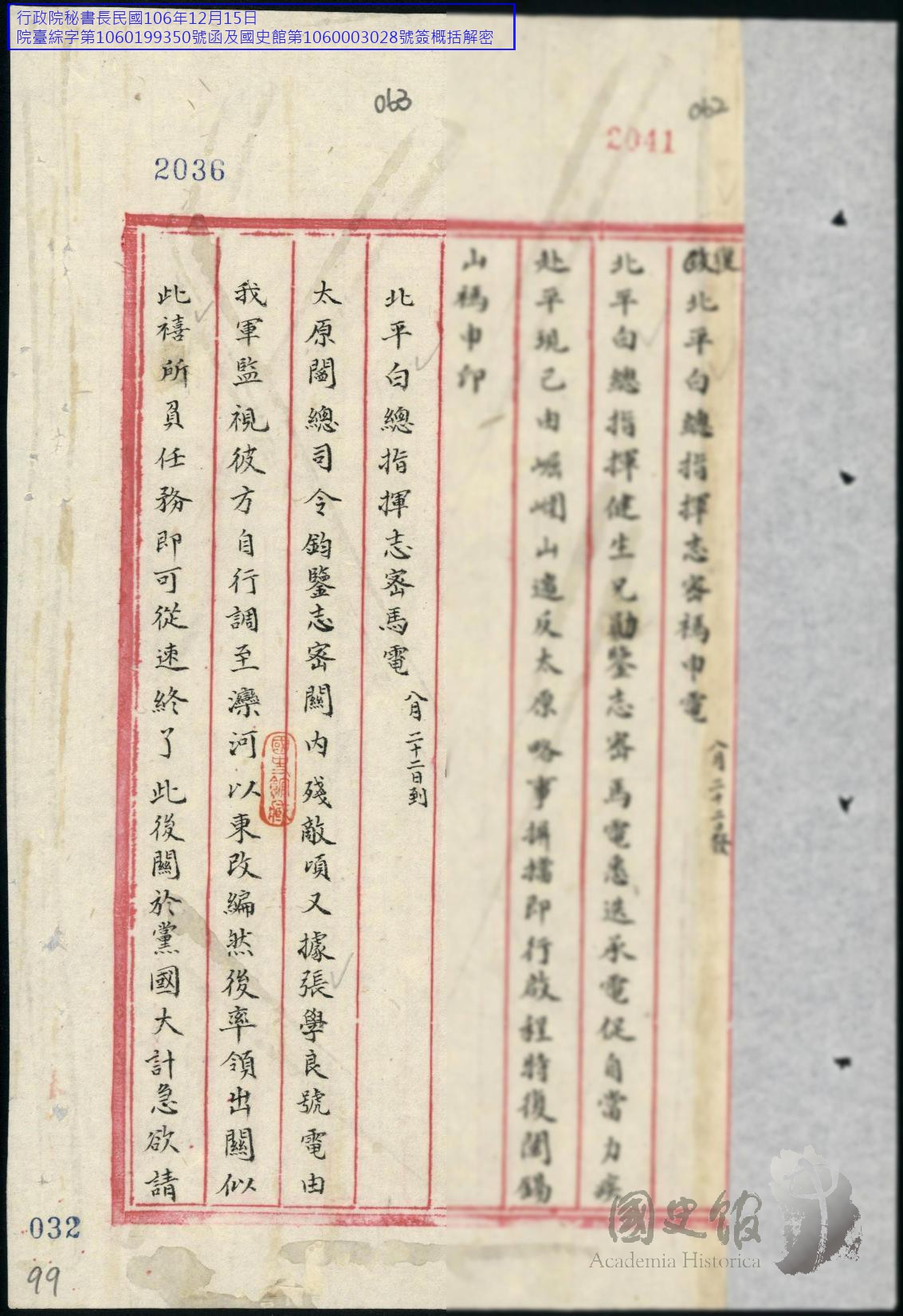 白崇禧電閻鍚山開內殘敵由我軍監視彼方自調至灤河以東