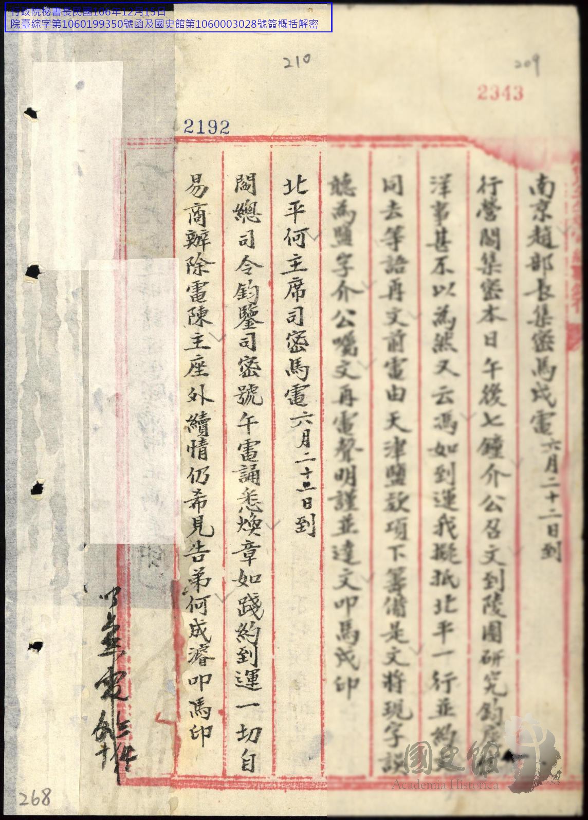 處理西北軍事斡旋和平案(一)【原卷名:處理西北軍事斡旋和平案邀馮出洋閻伯川先生要電錄存】