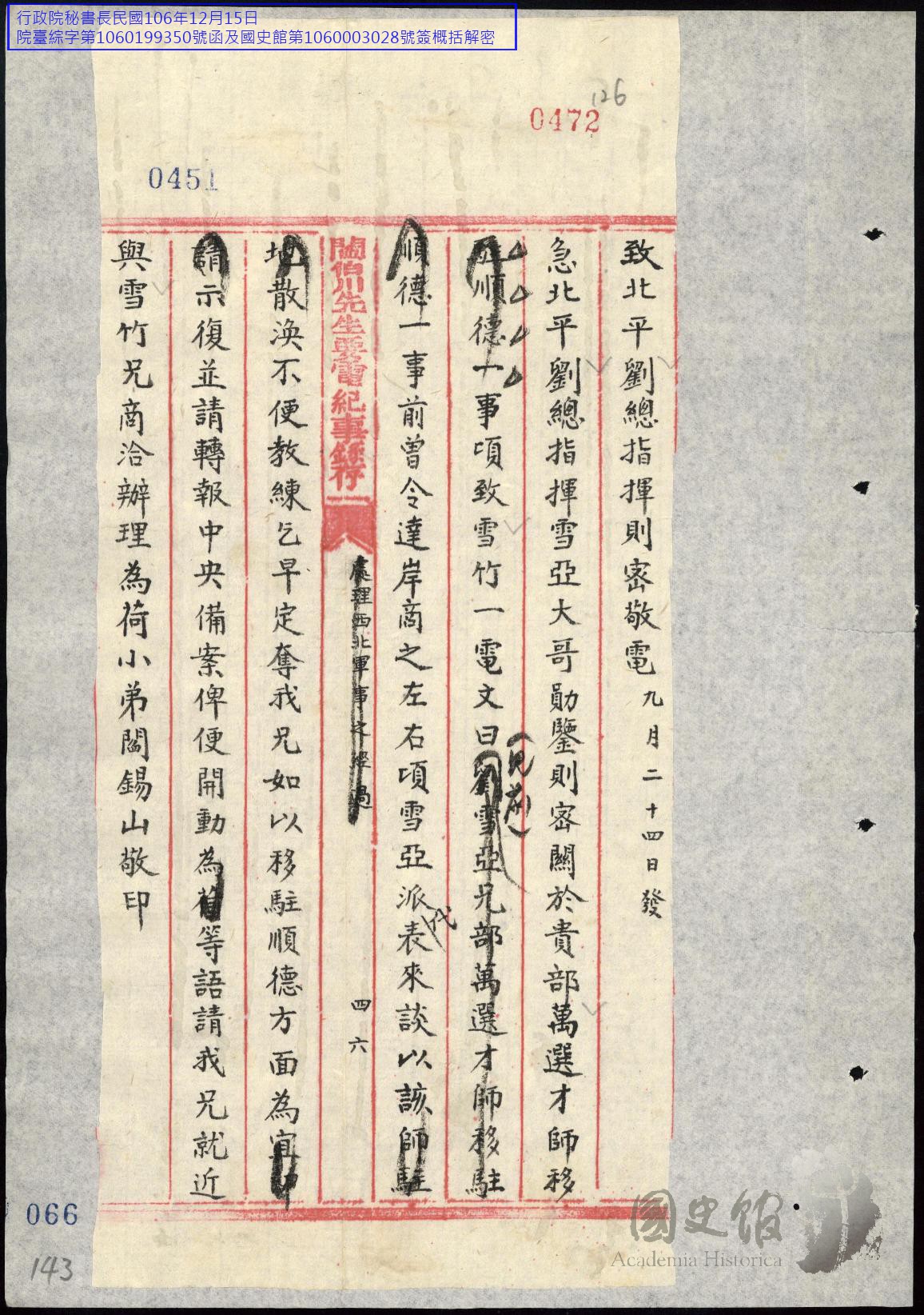 處理西北軍事斡旋和平案(三)【原卷名:閻伯川先生要電錄存處理西北軍事斡旋和平案籌辦善後】