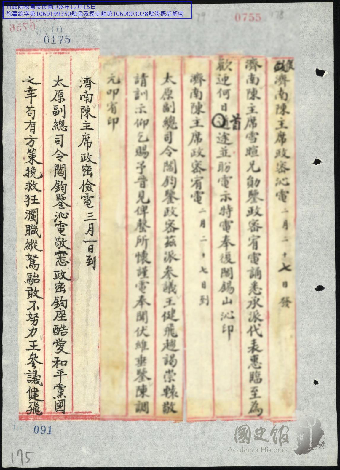 討論黨國大事軍事案(一)【原卷名:閻伯川先生要電錄存討論黨國大事軍事案】