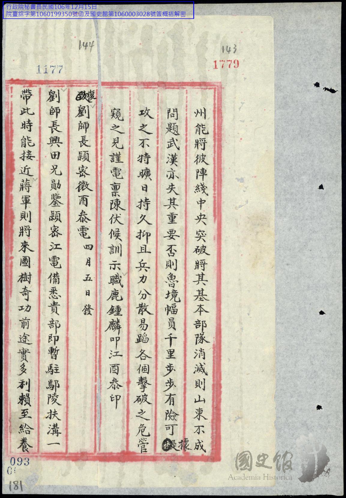 討論黨國大事軍事案(五)【原卷名:閻伯川先生要電錄存討論黨國大事軍事案】