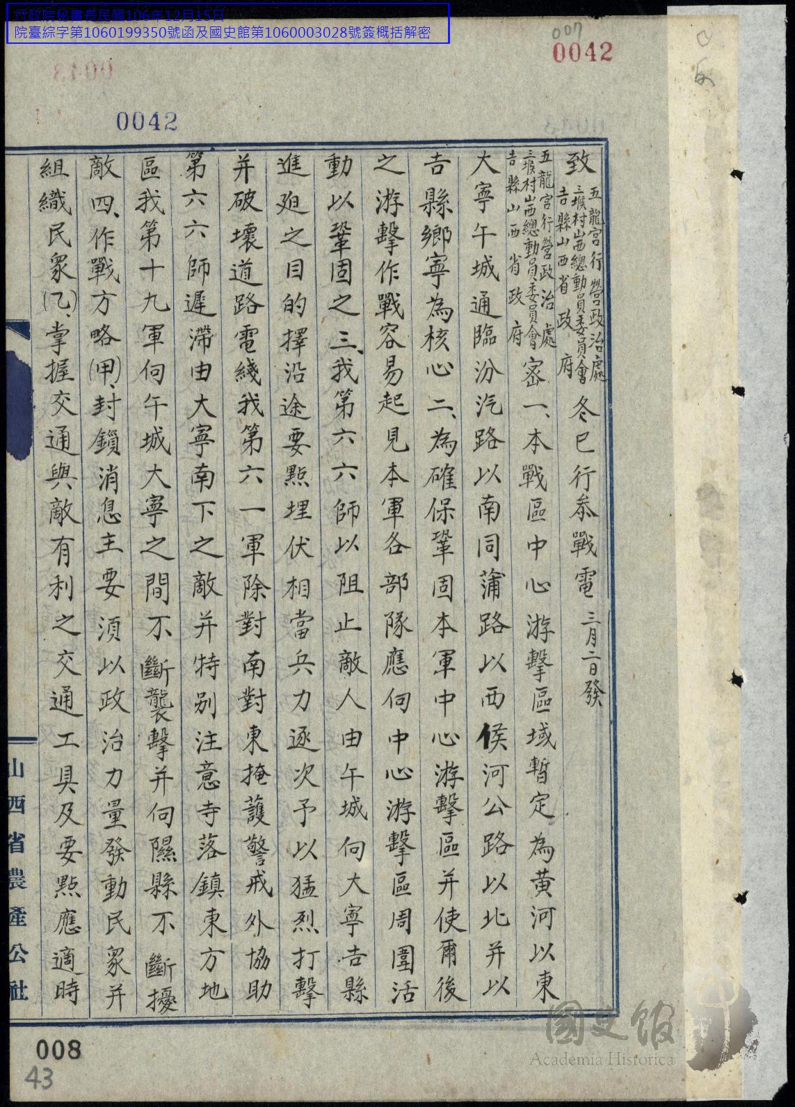 全面抗戰展開游擊戰創敵案(一)【原卷名:閻伯川先生要電錄存全面抗戰展開游擊戰創敵案】