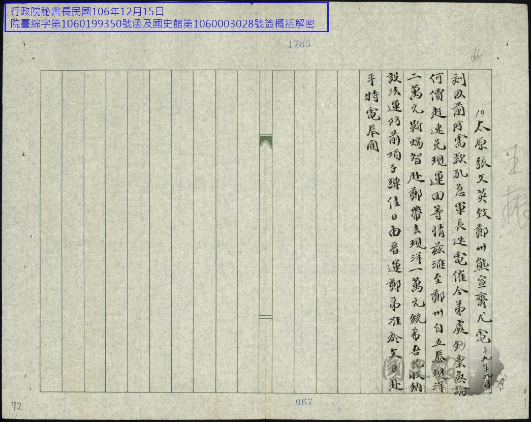 張文英電熊宣齋說明前方催款已帶去鄭州希收納運防子彈已由晉運鄭