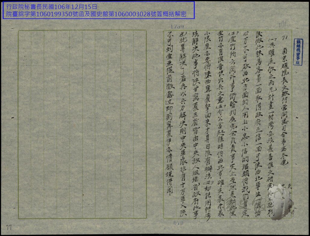 趙戴文電閻錫山再三研究就職後容易取得政府與西北軍信任與戒備