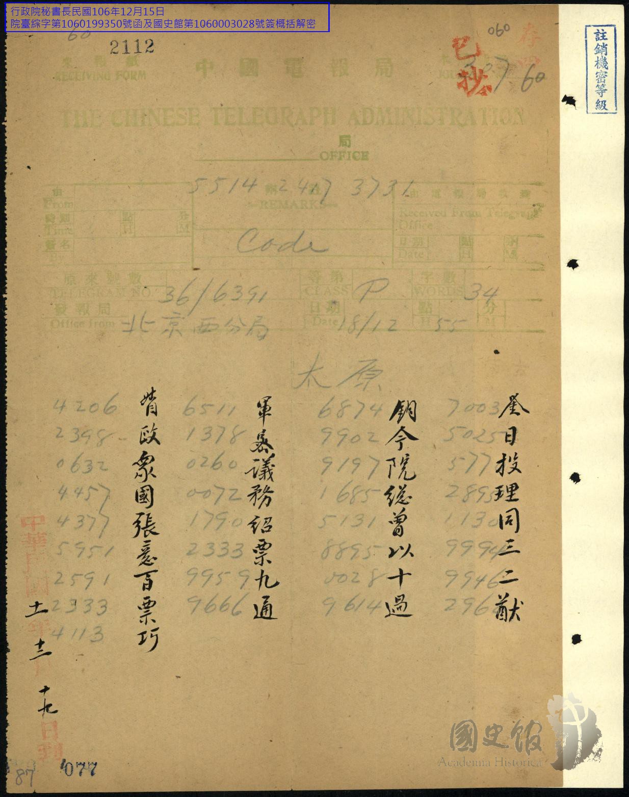 閻錫山史料/文件/電報/各方往來電文原案及錄存
