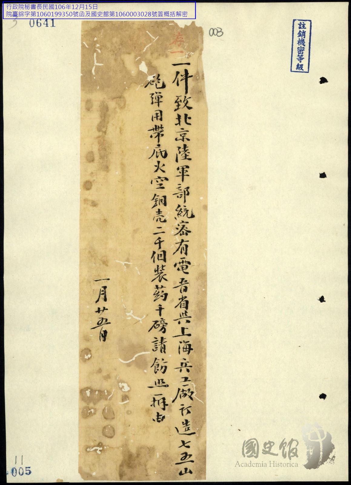 閻錫山電陸軍部與滬兵工廠訂定帶底火空銅殼請查辦並飭該廠辦理