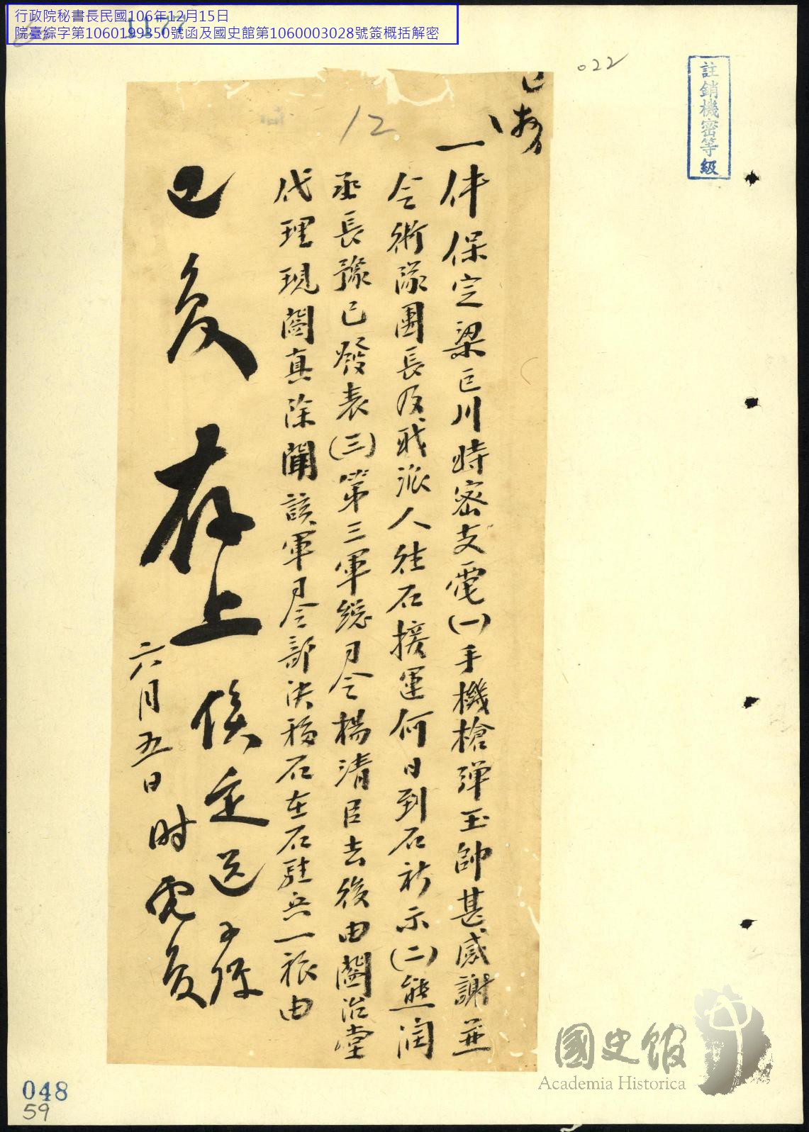 梁汝舟電閻錫山手機槍子彈吳佩孚甚感謝並令衛隊團團長各派人接運