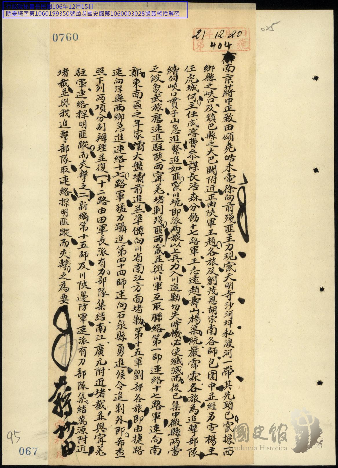 蔣中正電田頌堯徐向前主力竄天明寺先頭部隊已竄據西鄉附近