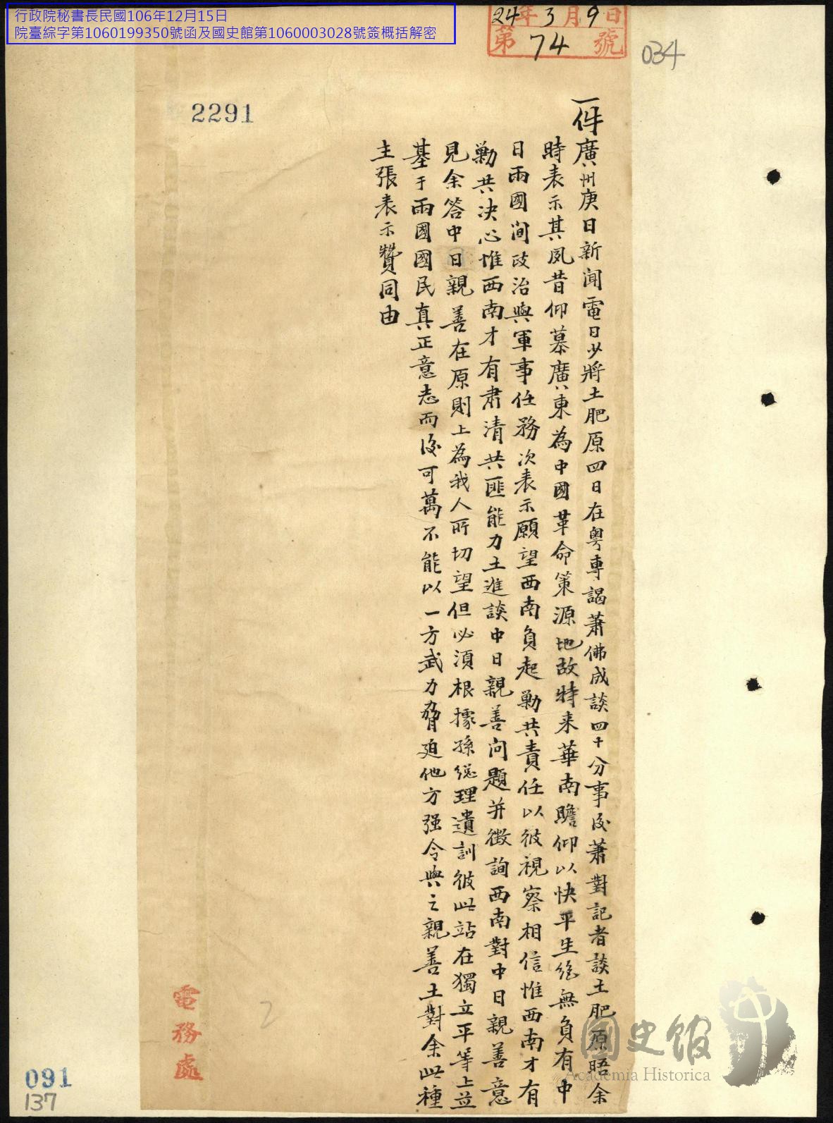 各方民國24年3月往來電文原案(一)【原卷名:各方民國廿四年三月往來電文原案】