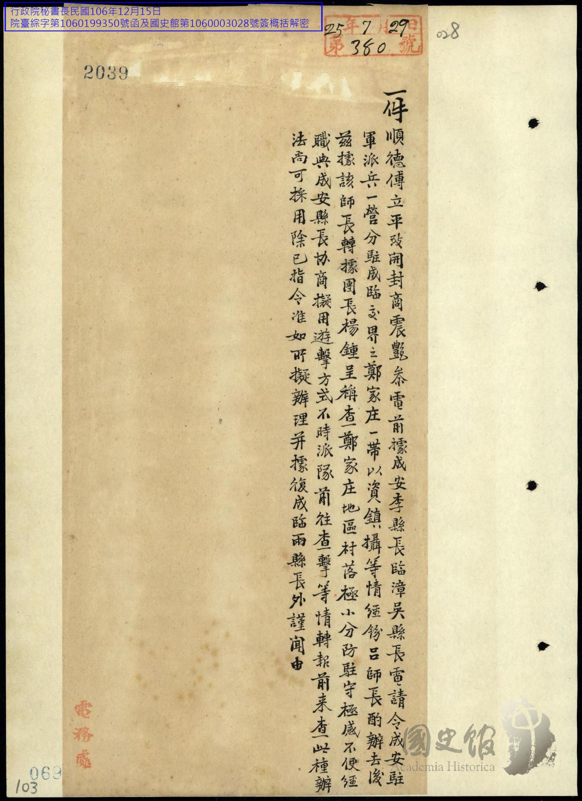 傅立平電商震據成安縣長等請令成安駐軍派兵一營分駐成臨交界之鄭家庄一帶