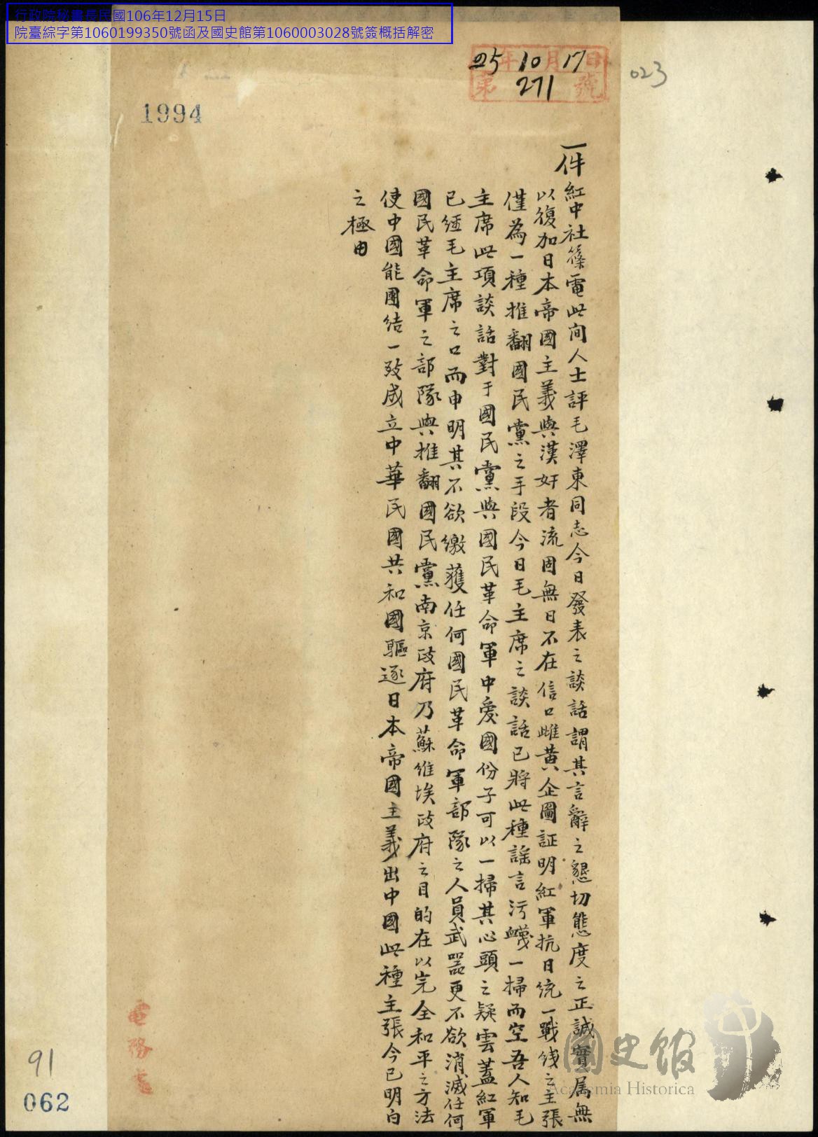各方民國25年10月往來電文原案(四)【原卷名:各方民國廿五年十月往來電文原案】