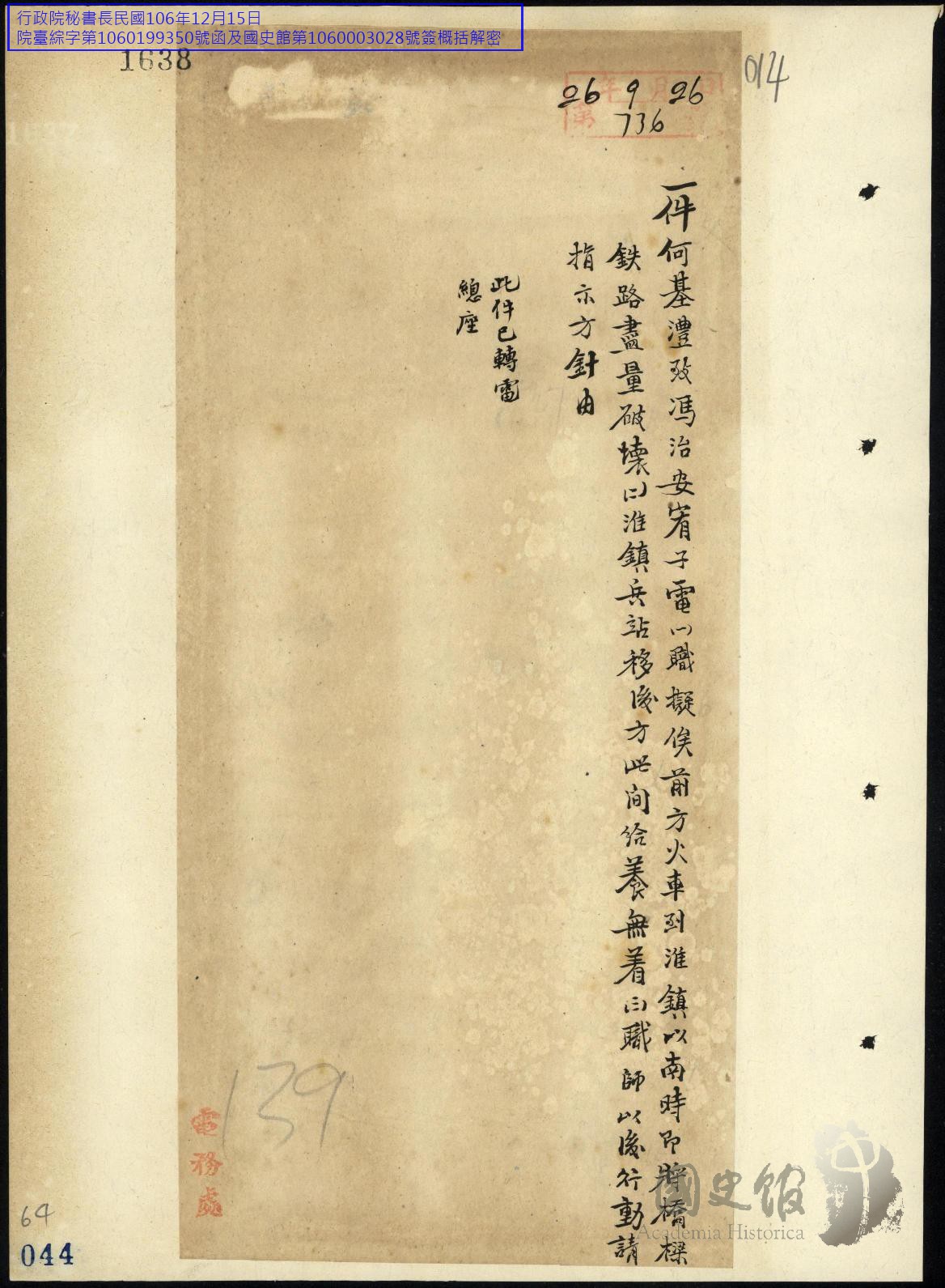 何基灃電馮治安職擬俟前方火車到准鎮以南時即將橋樑鐵破壞