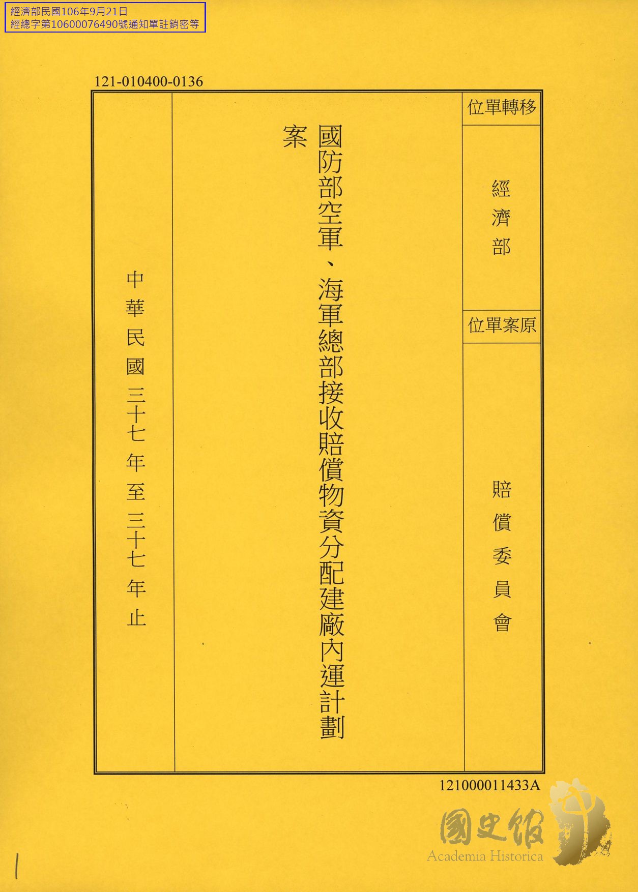 國防部空軍、海軍總部接收賠償物資分配建廠內運計劃案