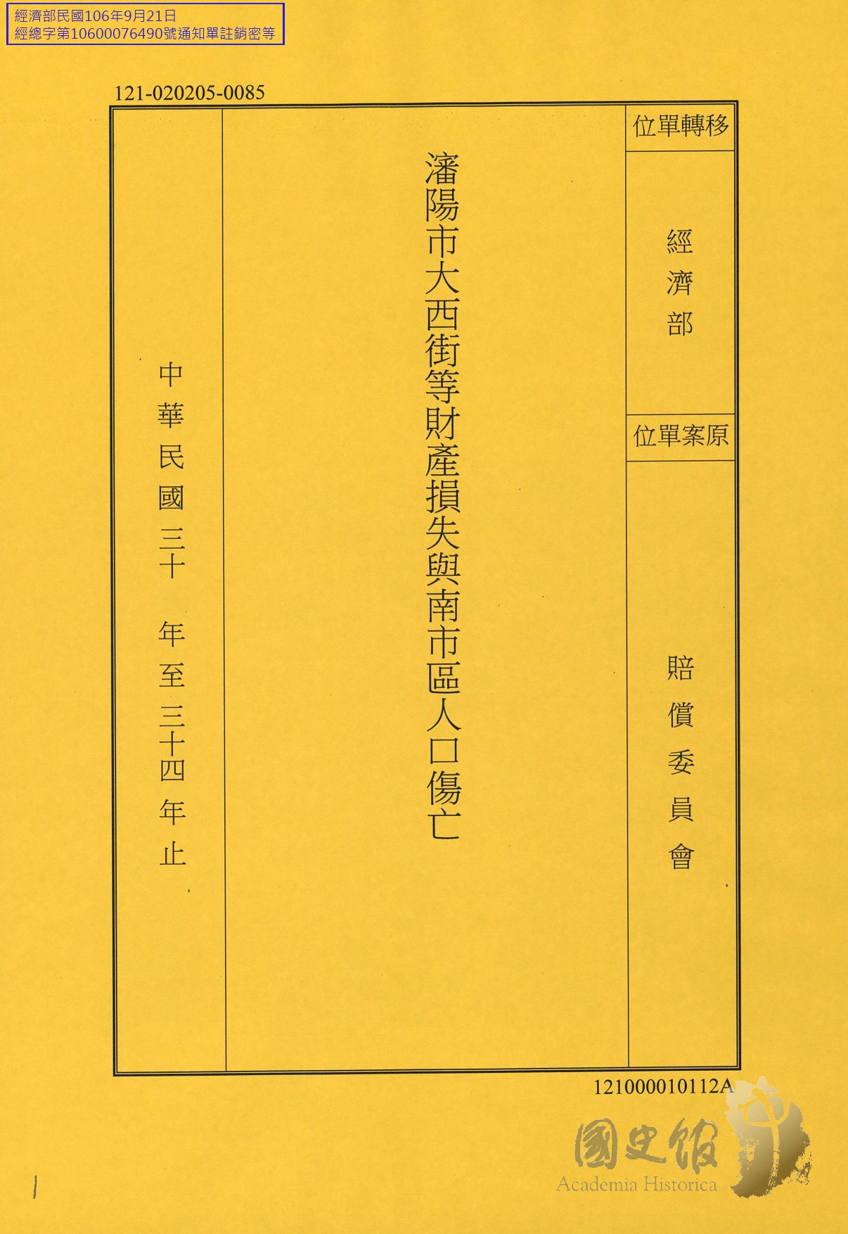 賠償委員會/損失調查統計/地方機關/東北地區