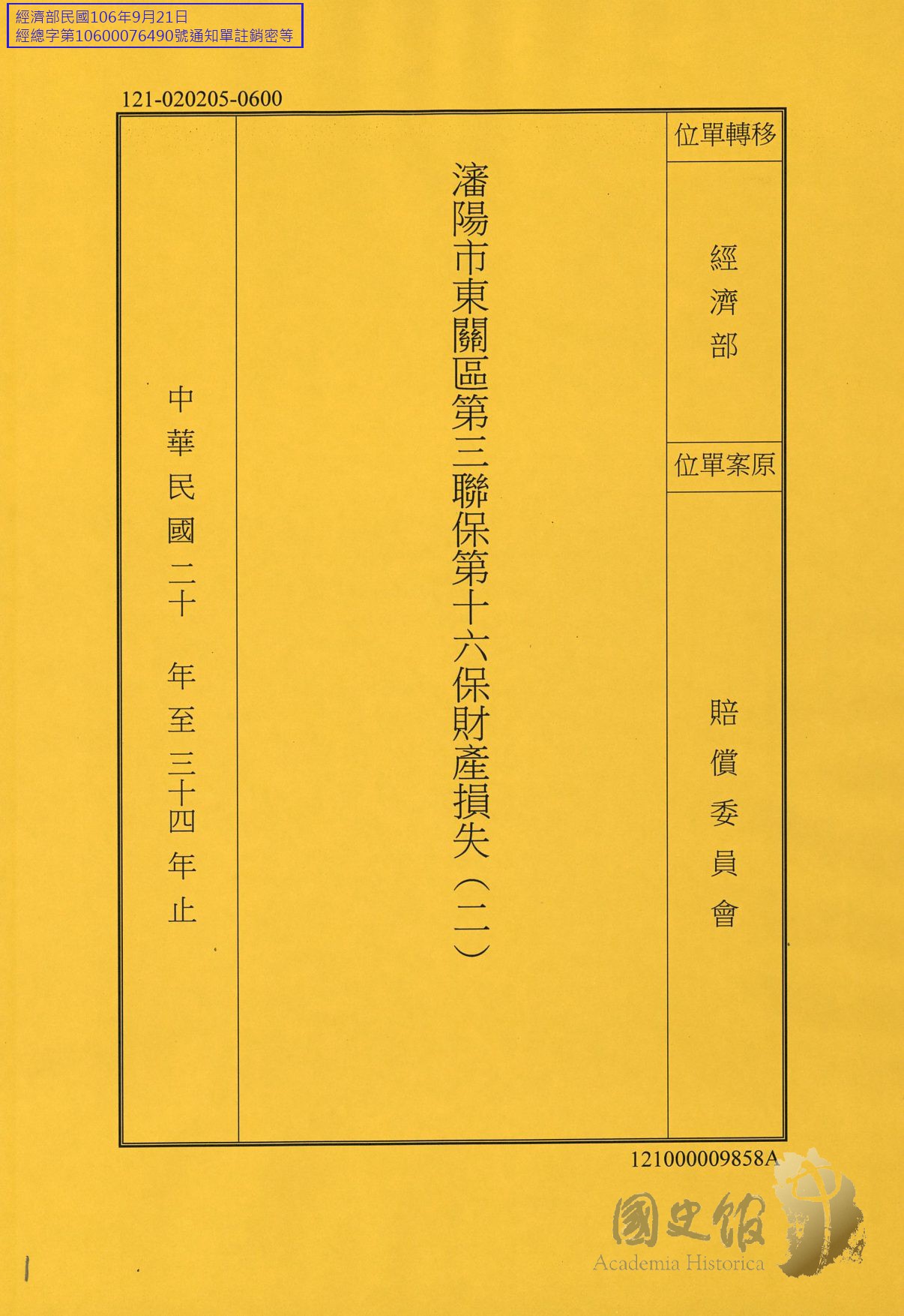 賠償委員會/損失調查統計/地方機關/東北地區