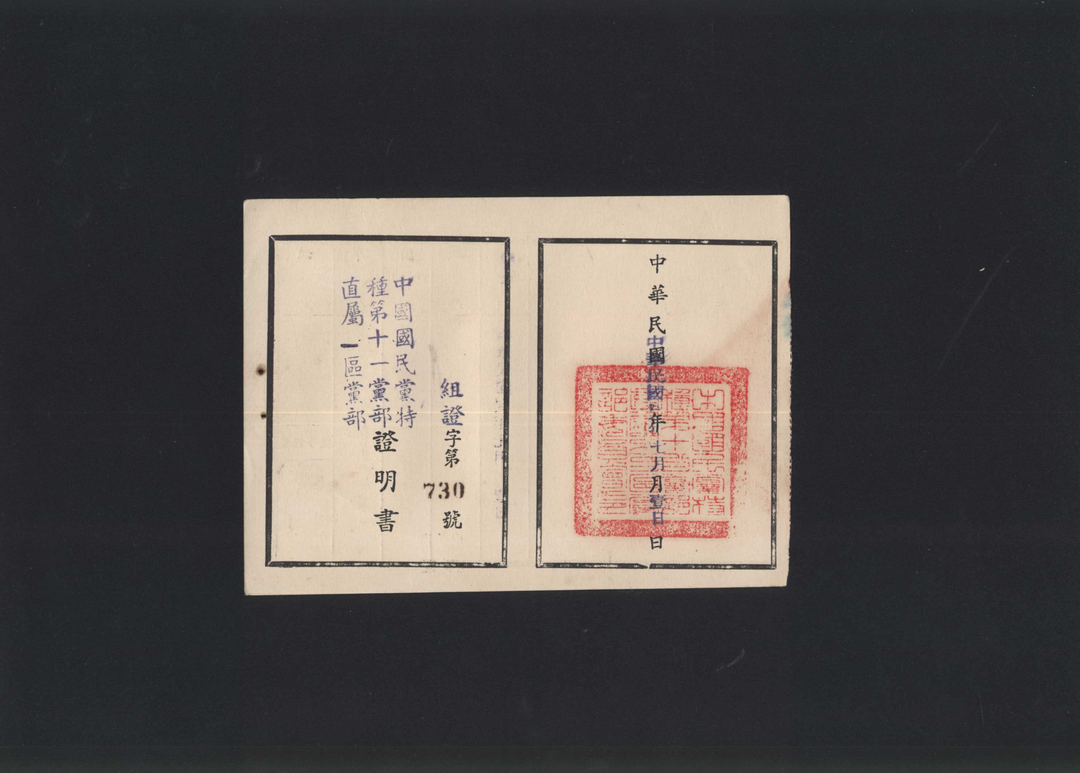 中國國民黨特種第十一黨部直屬一區黨部證明書為一張證明書,不具有國民黨黨徽,此證明書與一般黨證不同,以說明其為特殊黨員,正面除寫有證明書名稱外,還列有為組證字第730號,右側則有民國40年代(1950)7月1日核發,並蓋有中國國民黨特種第十一黨部證明書關防印。背面則羅列姓名、黨證字號、單位、屆次、職務、任用日期,並印有常務人員之姓名及印鑑。在黨國時代校園中的教官、師長普遍會建議學生加入國民黨,在取得黨證後,便有許多福利及優惠,包含:飯店、餐廳、飾品店皆有折扣,並有獎學金等補助,所以許多人從小便擁有黨證,對於家中較窮苦之學生幫助甚多,而此證明書證明其主要任職中國國民黨幹部,與一般黨證不同的是,其含有特殊身分,在福利上也更加優越,黨員層級更高。今日中國國民黨特種黨部多已不存在。