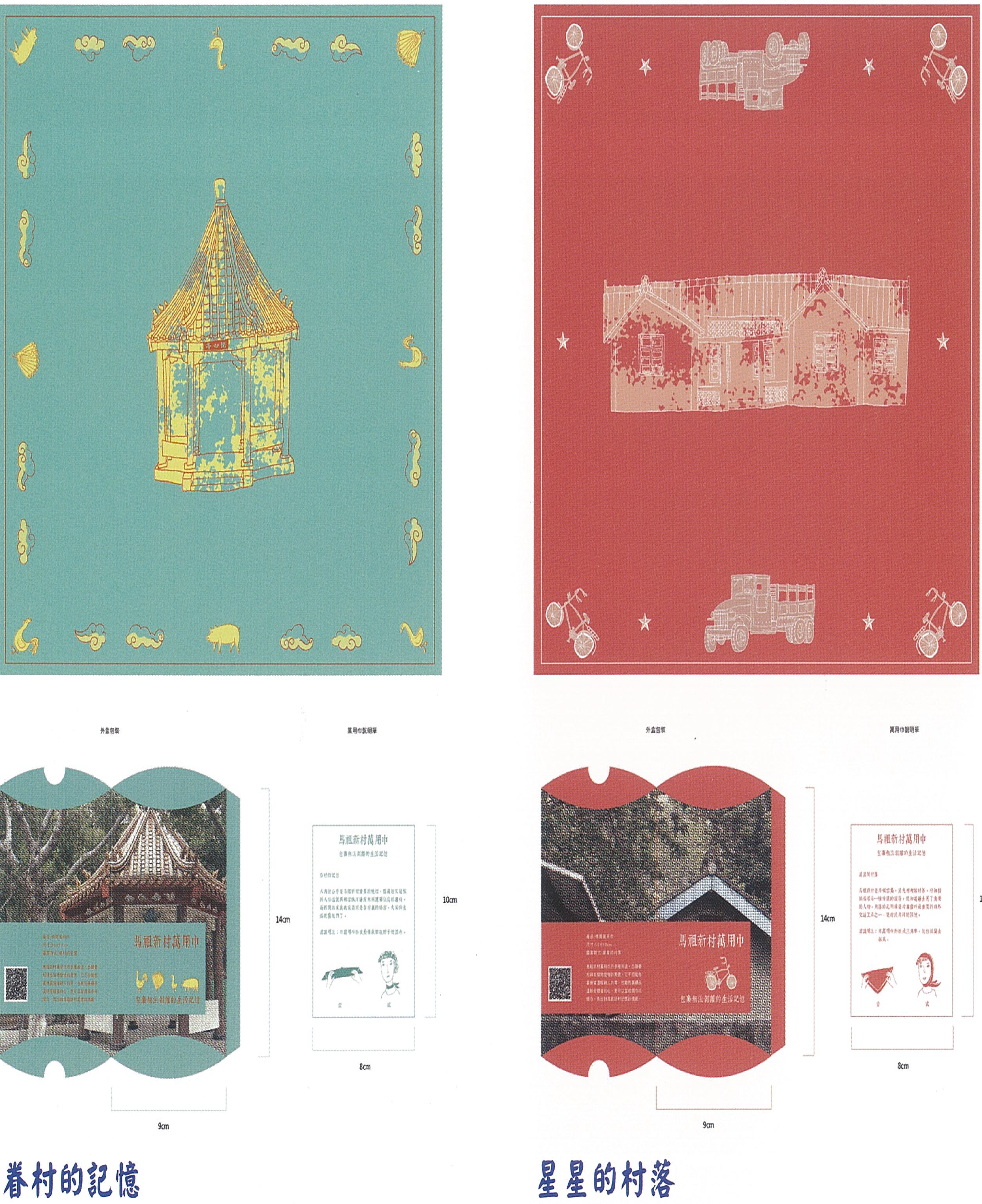 媒合設計師潘羽祐的「馬祖新村萬用巾」設計理念是包裹著無法剝離的生活記憶。中壢馬祖新村的居民以馬祖、金門前線捍衛國防將士的眷屬為主,居民主要是婦女和小孩。當時軍職薪水微薄,小孩又多,他們的生活相當清苦,總是想辦法貼補家用,縫衣加工對這些家眷來說是最常見的副業。潘羽祐表示,萬用巾的構想源自於此,希望能藉由貼身的布料與印花來貼近當時女性柔軟且堅毅的生活態度,也記憶在空間上,馬祖新村包容、庇護這些異鄉遊子的靈活運用。萬用巾包含「眷村的記憶」及「星星的村落」二款圖像,以手繪的方式呈現眷村的二大地標,並仿效大門標語油漆剝落的效果,象徵儘管硬體消退,但眷村的生活脈絡與記憶依然清晰。「眷村的記憶」圖案為八腳悅心亭,隱藏在天花板的八仙述說異鄉客飄洋過海來到蓬萊的過往,四周的家禽則是眷村裡的嬌客,居民的生活就靠牠們了。「星星的村落」則是因馬祖新村將領雲集,仔細抬頭看每一幢房屋的屋脊就能了解過去居住的重要人物,角落的孔明車是村裡當時最重要的聯外交通工具,也是村民共同的回憶。