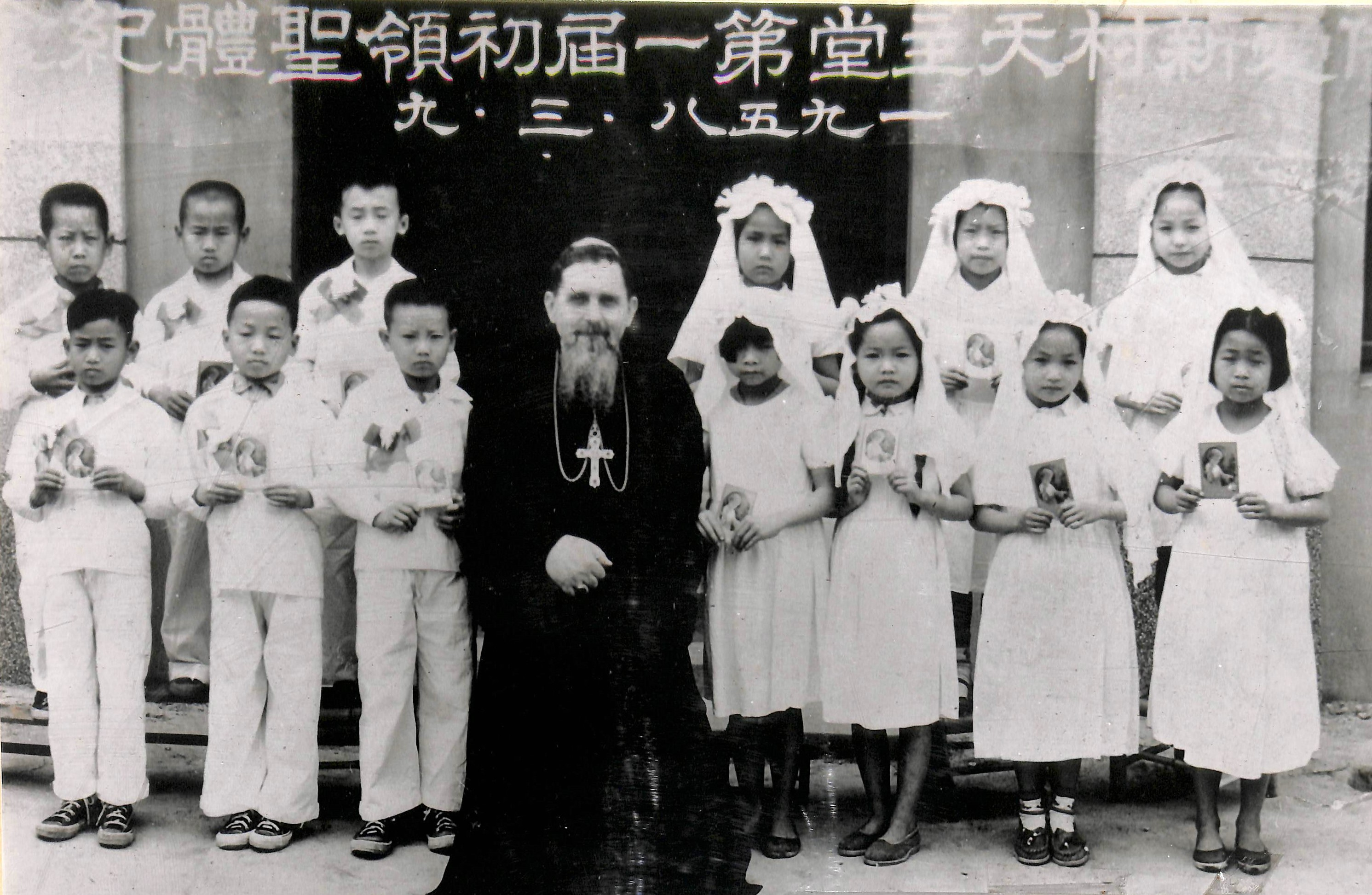 此為大溪僑愛新村原眷戶林劉素華提供大溪區僑愛社區發展協會,題名〈僑愛新村天主堂第一屆初領聖禮紀念〉的照片,拍攝於民國47年(1964)3月9日。 在這張照片中央的外國人為知名的藍澤民(Archbishop Secondino Petronio Lacchio, O.F.M. 1901-1976)主教,他原是天主教長沙教區主教。1952年3月30日被逐出中國大陸,乃至桃園傳教,服務教徒,其與天主教輔仁大學校長于斌樞機主教是好友。對於數年後桃園總鐸區的成立實在功不可沒,特別是為人服務的精神令人敬佩。照片中當時盛裝參加初領聖體的小朋友胡南雲、林衡輝、張載澎、張載湖兄弟及鍾柳生等,當年僅9歲而已,如今都已七十好幾了。 民國96年(2007),僑愛社區發展協會將其收錄在2007桃園眷村文化節出版的《僑愛新村建村50週年慶紀念冊》中。