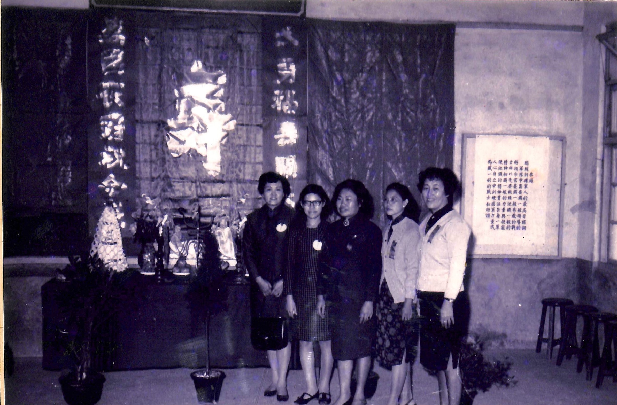 此為大溪僑愛新村原眷戶鍾鳳鳴、胡彭俠提供大溪區僑愛社區發展協會,題名〈年年祝壽〉的照片,約拍攝於民國60至63年(1971-1974)間。 從民國46年(1957)僑愛新村建村開始,由中華婦女反共抗俄聯合會僑愛新村工作隊出面於10月31日舉辦慶祝蔣中正總統華誕的活動已是村中每年必有的一個儀式。眷村媽媽們布置壽堂、製作祝壽海報,僑愛國小學生排隊到壽堂拜壽,然後一人一個壽桃的記憶,直到今日仍刻印在腦海中。在這張的照片中,壽堂上寫著大大的「壽」字,桌上擺著成塔的壽桃,中華婦女反共聯合會聯勤分會總幹事張勝男(左起)、中華婦女反共聯合會聯勤分會幹事張美鳳、中華婦女反共聯合會僑愛新村工作隊隊長胡彭俠......等於前合影。 民國96年(2007),僑愛社區發展協會將其收錄在2007桃園眷村文化節出版的《僑愛新村建村50週年慶紀念冊》中。