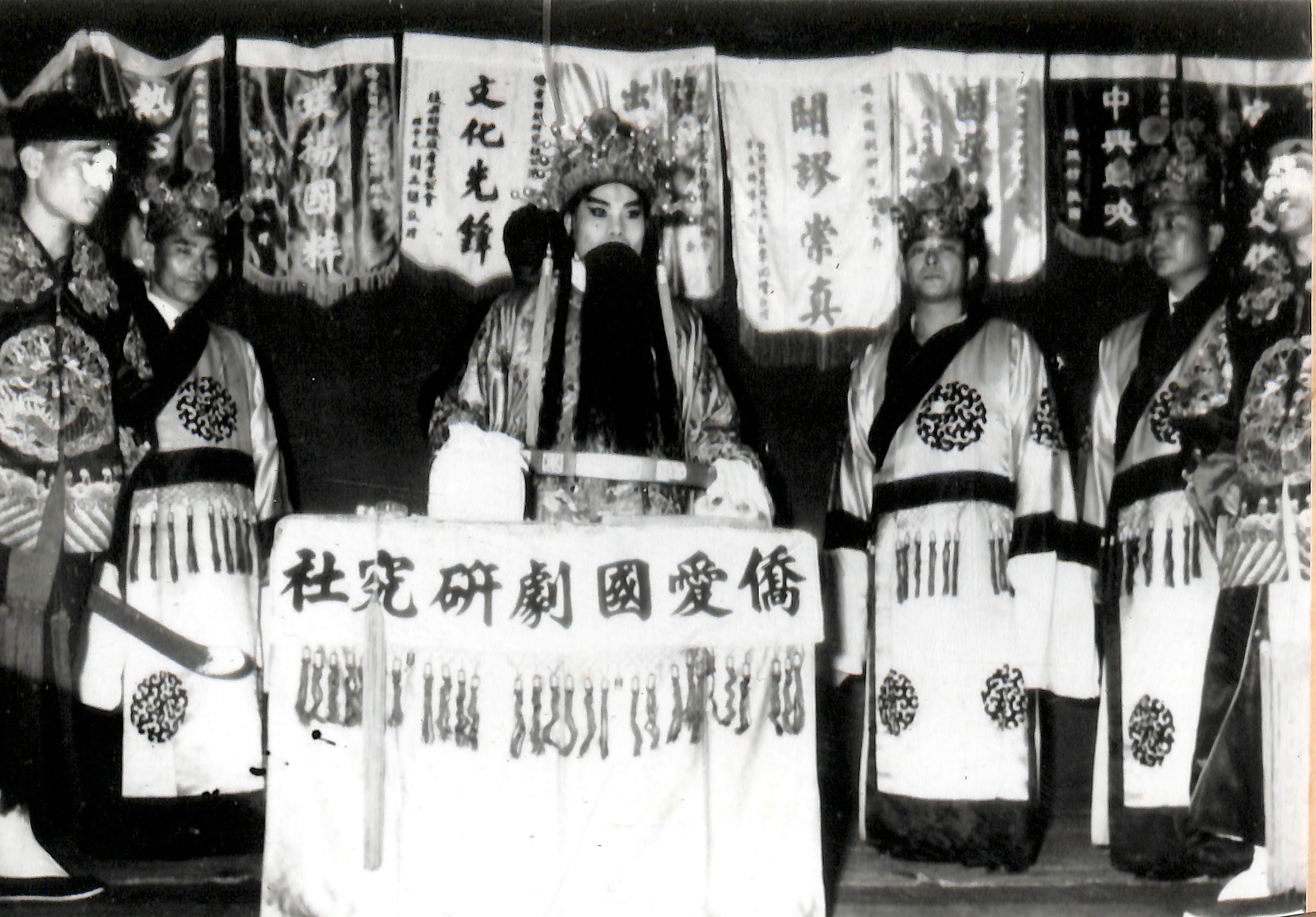 此為大溪僑愛新村原眷戶范超群提供大溪區僑愛社區發展協會,題名〈元老級社團〉的照片,約拍攝於民國53年(1964)。 國劇是眷村爸媽,從大陸到臺灣、從僑愛到外地,一直以來不變的嗜好。由范超群、房段春芳等一群國劇迷籌組僑愛國劇研究社,是僑愛新村早的社團,這群票友從年輕唱到年老,直到現在,每週六下午還在敲敲打打、哼哼唱唱,幾乎風雨無阻。這張照片即范超群等演出薛平貴得到代戰公主的援助,攻破長安,拿獲王允、魏虎,自立為帝,坐上龍位,封官授爵,清算餘孽的《大登殿》的一幕。像僑愛國劇研究社這樣的業餘演唱者稱為「票友」,票友定期聚會切磋,無服裝、道具亦不化妝,更無一堆繁文縟節,只有文武場,照劇本選段清唱的稱為「票房」,票友演戲則稱為「票戲」或「玩票」。除了居住在僑愛新村居民外,僑愛國劇研究社不乏來自其他地區的票友。 民國96年(2007),僑愛社區發展協會將其收錄在2007桃園眷村文化節出版的《僑愛新村建村50週年慶紀念冊》中。