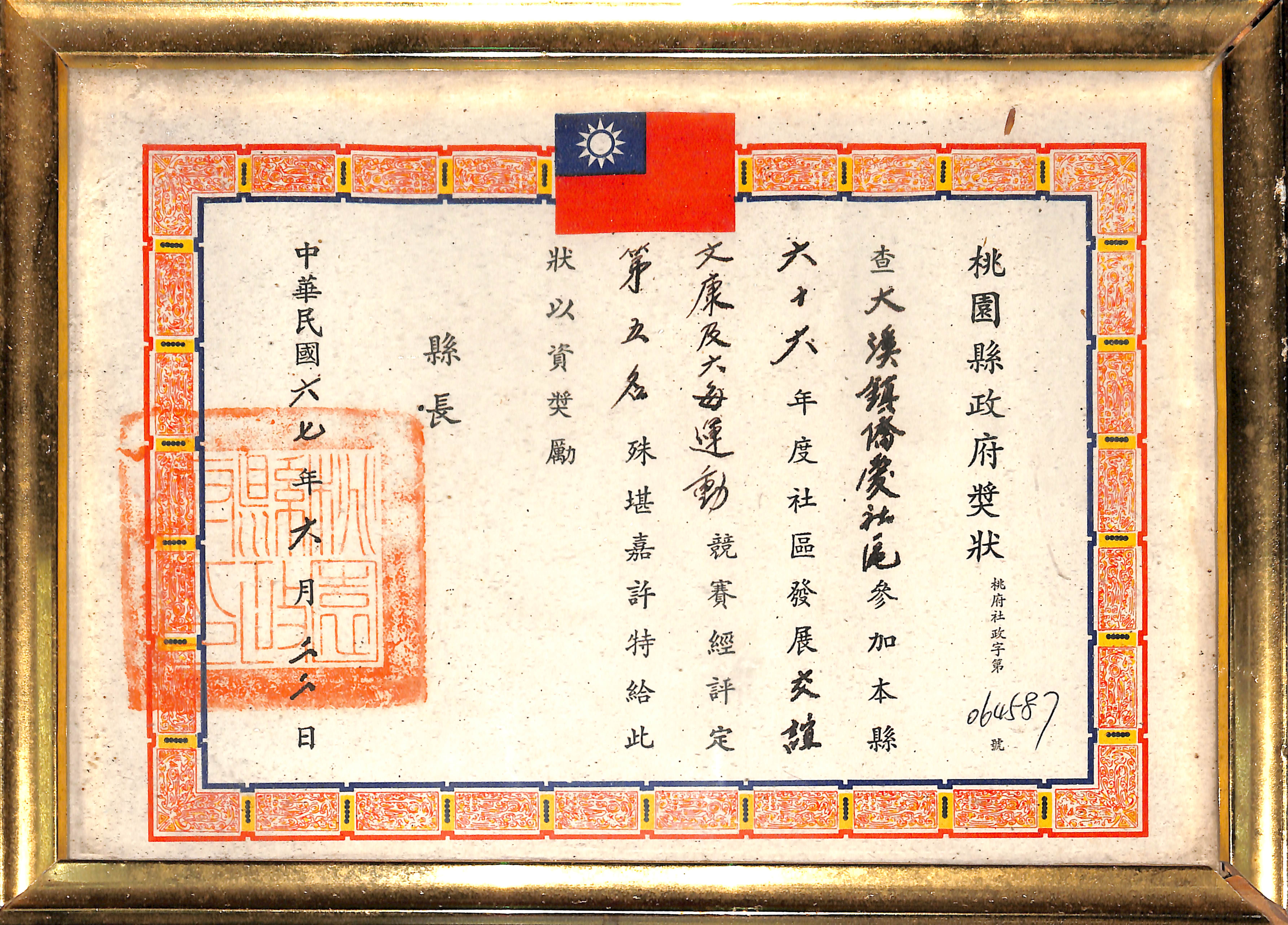 此為大溪區僑愛社區活動中心藏僑愛新村之桃園縣政府獎狀。 僑愛新村,民國46年(1957)建,由總統夫人蔣宋美齡所領導的中華婦女反共抗俄聯合會號召菲律賓華僑所捐建,故名。民國67年(1978)6月22日,僑愛新村由於「參加本縣(桃園縣)六十六年度社區發展交誼文康及六每運動競賽經評定第五名殊堪嘉評」,縣長特給此狀,以資獎勵。 令人意外的是獎狀上沒有縣長的簽名,原來是因為原任縣長吳伯雄轉任臺灣省菸酒公賣局局長一職,而由臺灣省政府委員會委員翁鈐代理。