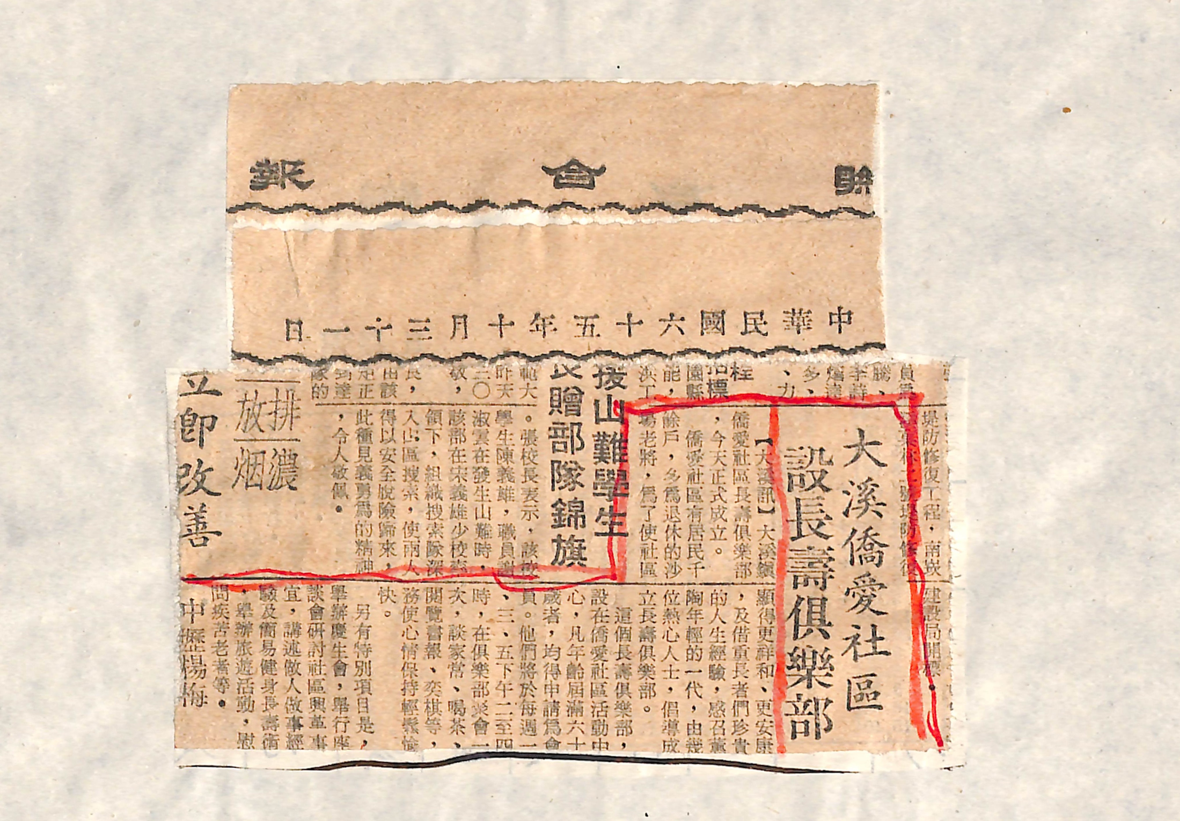 此為桃園市大溪區僑愛社區活動中心藏原僑愛新村剪報,內容為民國65年(1976)10月31日《聯合報》的〈大溪鎮僑愛社區設長壽俱樂部〉。僑愛新村,民國46年(1957)建,由當時的總統夫人蔣宋美齡所領導的中華婦女反共抗俄聯合會號召菲律賓華僑所捐建,故名。按《聯合報》載,民國65年(1976)10月31日,桃園縣大溪僑愛里社區長壽俱樂部成立,僑愛社區有居民千餘戶,多為退伍沙場老將,為使社區顯得更祥和、更安康,及借重長者們珍貴的人生經驗,感召薰陶年輕的一代,由幾位熱心人士,倡導成立長壽俱樂部。俱樂部設在僑愛社區活動中心,屆滿60歲以上之長者均得申請為會員。將於每周一、三、五下午2至4點在俱樂部聚會一次,談家常、喝茶、閱覽書報、弈棋等,使心情保持輕鬆愉快。另有特別項目是,舉辦慶生會,舉行座談會研討社區興革事宜,講述做人做事經驗及簡易健身長壽術,舉辦旅遊活動,慰問疾苦老者等。