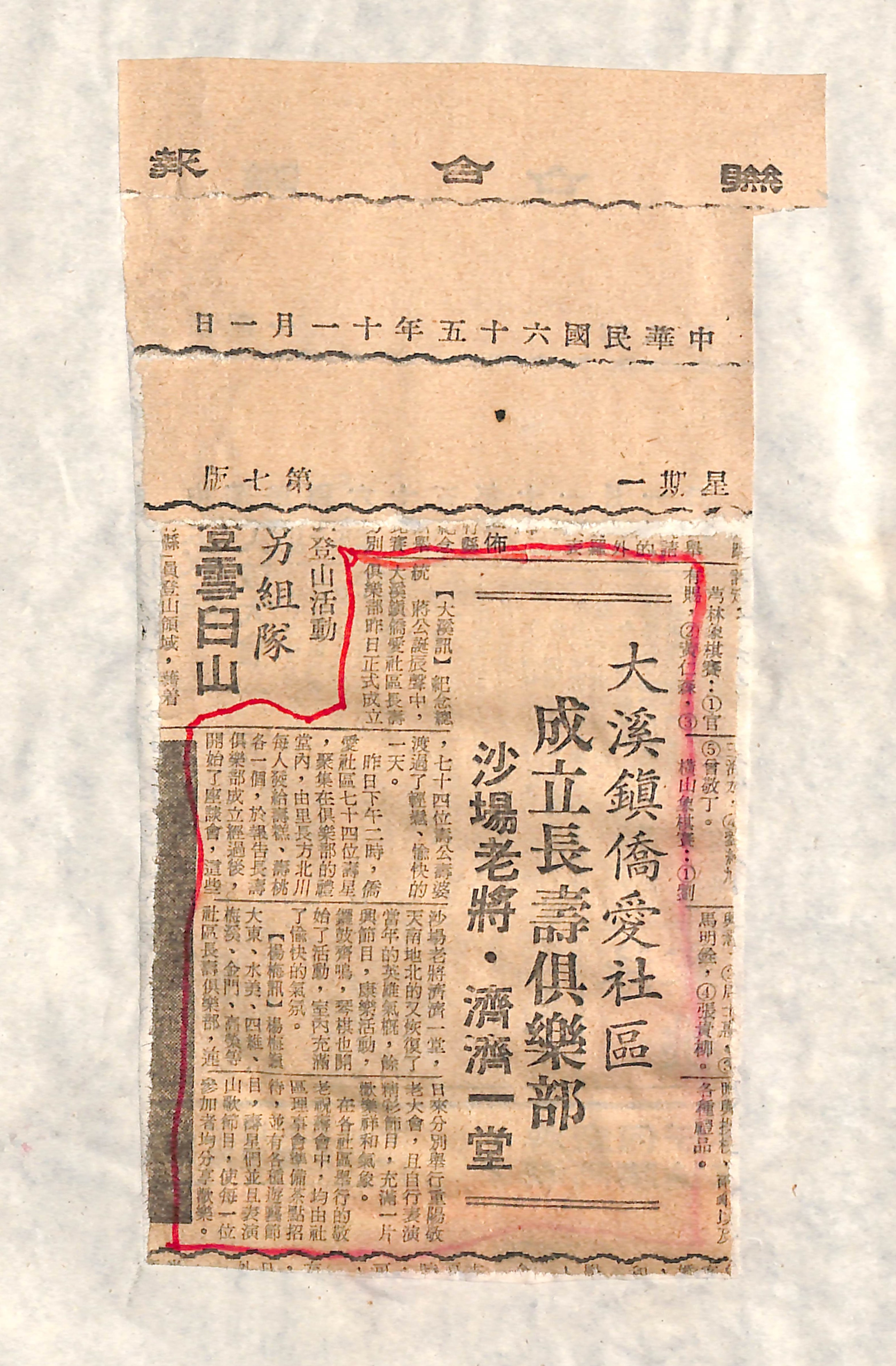 此為桃園市大溪區僑愛社區活動中心藏原僑愛新村剪報,內容為民國65年(1976)11月1日《聯合報》第7版的〈大溪僑愛社區 成立長壽俱樂部 沙場老將‧濟濟一堂〉。僑愛新村,民國46年(1957)建,由當時的總統夫人蔣宋美齡所領導的中華婦女反共抗俄聯合會號召菲律賓華僑所捐建,故名。按《聯合報》載,在紀念總統 蔣公誕辰聲中,大溪鎮僑愛社區長壽俱樂部於民國65年10月31日正式成立,74位壽公壽婆聚集在禮堂內,由里長方北川每人發給壽糕、壽桃各1個,並於報告長壽俱樂部成立經過後開始座談會,這些沙場老將齊聚一堂,天南地北的,又恢復了當年的英雄氣概,餘興節目,康樂活動,鑼鼓齊鳴,琴棋也開始了活動,室內充滿愉快氣氛,渡過輕鬆愉快的一天。