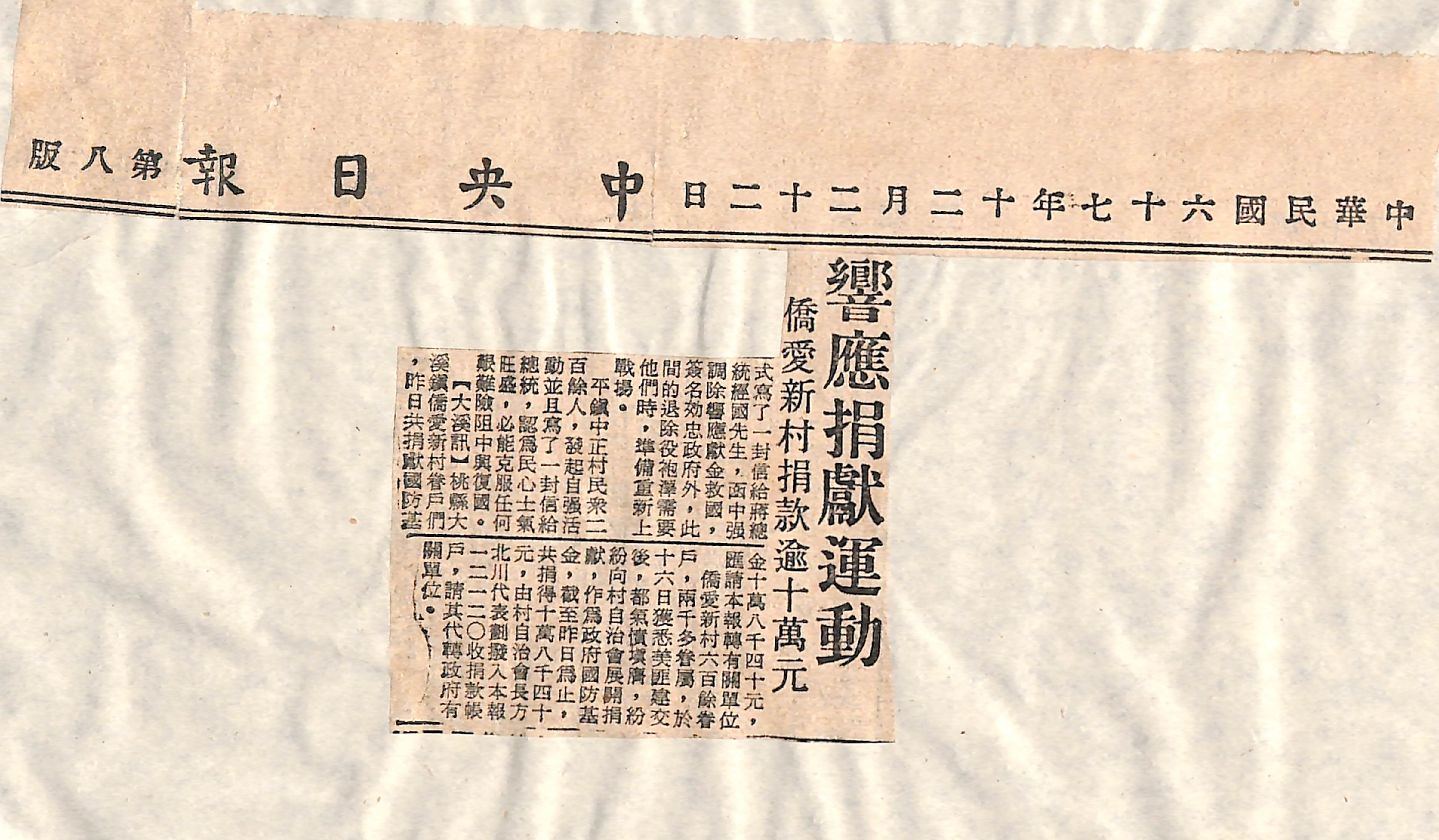 此為桃園市大溪區僑愛社區活動中心藏原僑愛新村剪報,內容為民國67年(1978)12月22日《中央日報》第8版的〈響應捐獻運動 僑愛新村捐款逾十萬元〉。僑愛新村,民國46年(1957)建,由當時的總統夫人蔣宋美齡所領導的中華婦女反共抗俄聯合會號召菲律賓華僑所捐建,故名。民國67年(1978)12月16日,美國總統卡特(James Earl "Jimmy" Carter, Jr.)宣布將於翌年與我斷交,按《中央日報》載,僑愛新村600餘眷戶,2,000多眷屬於12月16日獲悉美匪建交後都氣憤填膺,紛紛向村自治會展開捐獻,做為政府國防基金,至12月21日為止,共捐得108,040元,由自治會會長方北川代表劃撥入中央日報收捐款帳戶,請其代轉政府有關單位。