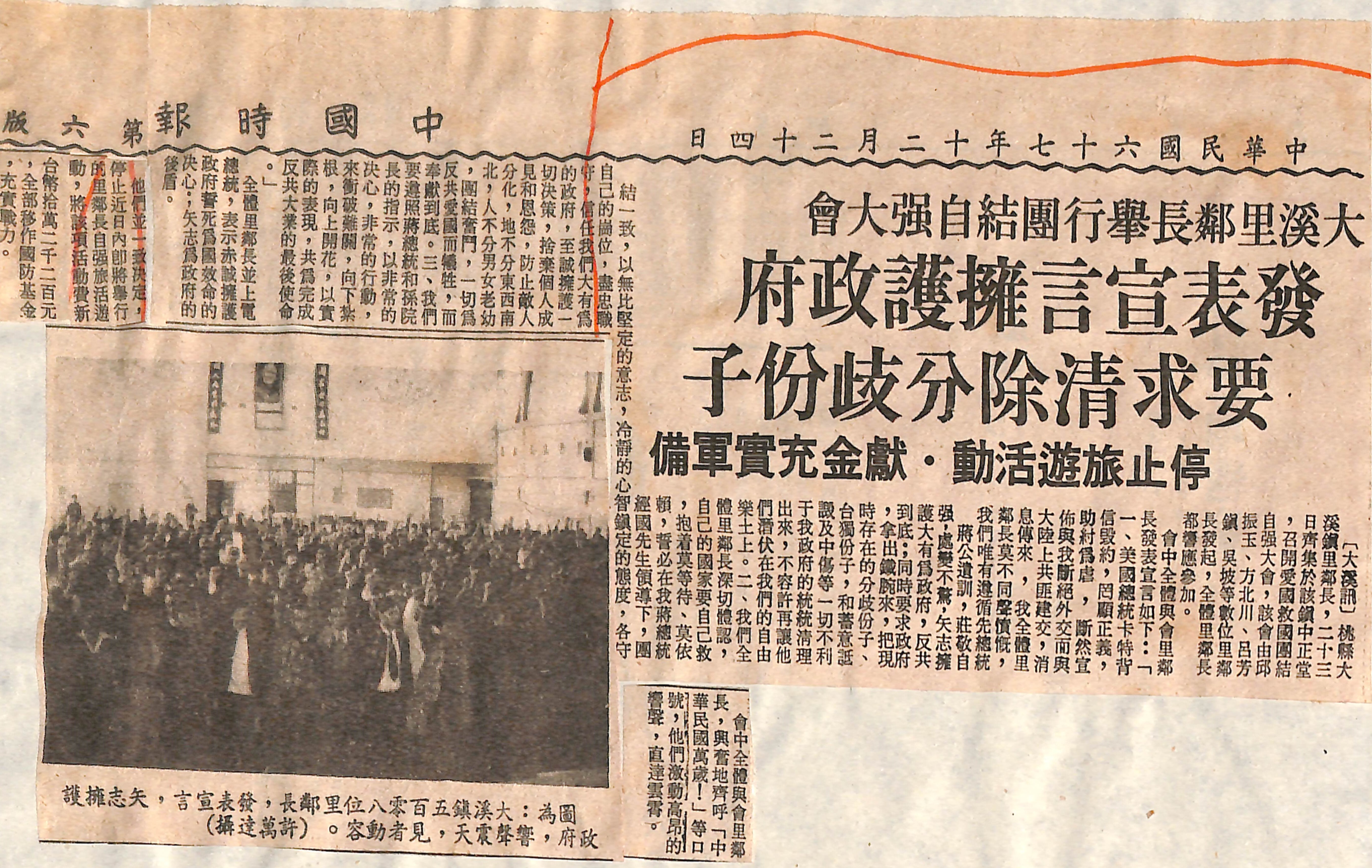 僑愛新村-〈大溪里鄰長舉行團結自強大會 發表宣言擁護政府 要求清除分歧份子......〉剪報
