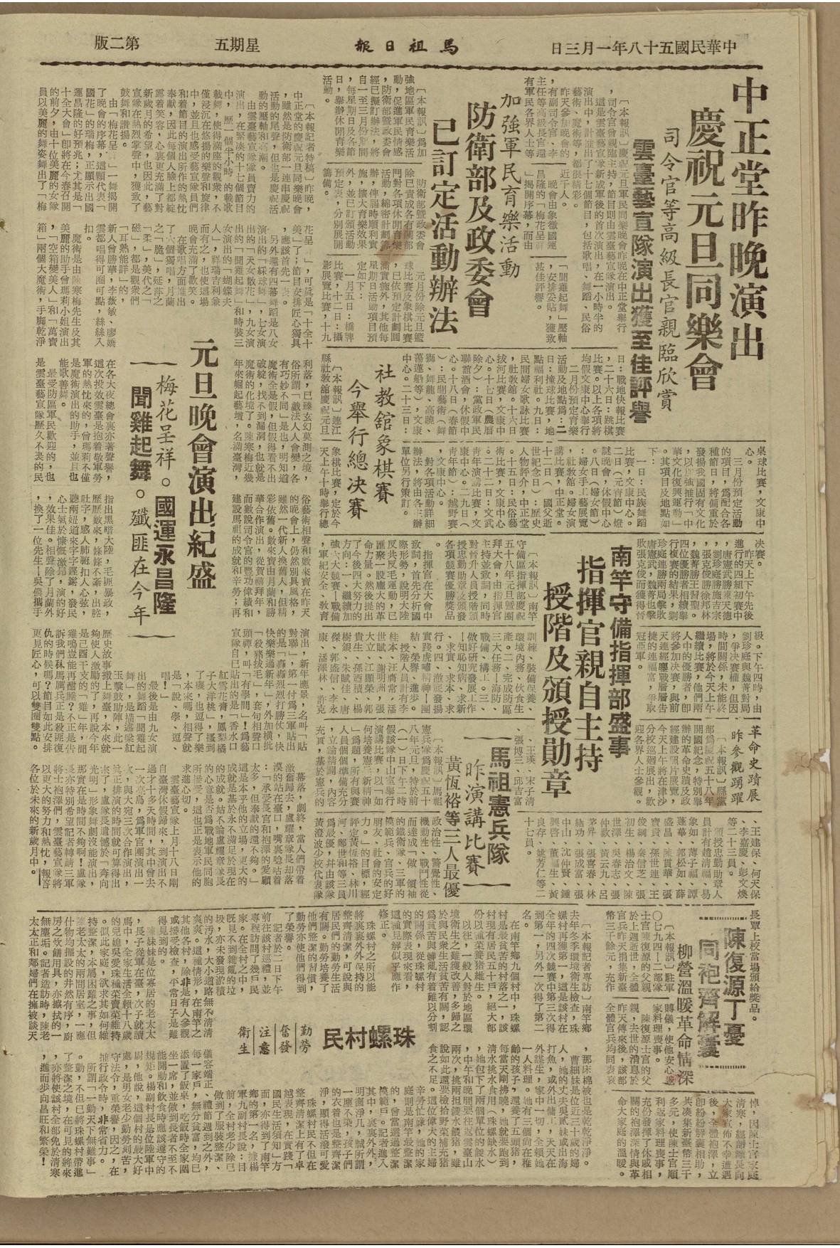 1969年(民國58年)馬祖防衛部暨政委會為加強地區軍民育樂活動,促進軍民情感,頒布育樂辦法,從一至三月份期間,每星期日及各節日都舉辦休閒育樂活動,並公布活動表與內容。據《馬祖日報》58年1月3日報導指出,一月於文康中心有元旦籃球比賽及象棋比賽橋牌比賽、攝影展覽比賽、戰地快報比賽、跳棋比賽。 二月有於福利社有撞球比賽、社教館有民間婦女歌詠比賽、文康中心有拔河比賽、農曆除夕於休假中心有黨政軍民聯誼酒會,休假中心、春節於文康中心有民間藝術(舞獅、舞龍、高蹺、蕩蓮船等)、文康中心有桌球比賽。 三月份為配合各種節日以加強推行「中華文化復興運動」,活動有於文康中心的民族舞蹈比賽、於元宵節在休假中心的燈謎晚會、婦女節社教館的婦女手工藝展覽、與中正堂的婦女潢講比賽、國父逝世紀念日中正堂的歷史人物評介、於文康中心的民俗藝術比賽、於文康中心的文武青年演講比賽、青年節文康中心的越野賽等活動,充實當時馬祖的假日生活。