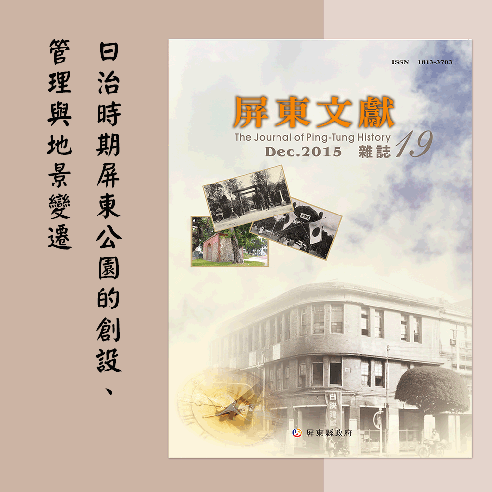 《屏東文獻第19期》〈日治時期屏東公園的創設、管理與地景變遷〉出版於2015年12月,由利天龍撰寫。本文主要介紹日治時期屏東公園的創設,並從中探討其對於屏東發展的影響。屏東公園最早在1902年(明治35年)即設立,已有113年的歷史,為南臺灣最早的公園綠地建設,臺灣第三個市街地公園。是由首任阿猴廳長桑原外助任內草創,為了改善阿緱街惡劣的衛生環境。後續透過徵集私有地與糖業會社寄附土地等方式擴張公園腹地,成為現今屏東公園的雛型。本文透過臺灣總督府公文類纂及各種公私部門等日文舊籍,釐清日治時期屏東公園的創設過程。並經由土地臺帳、土地登記簿與地籍圖資的比對,探討公園腹地之擴張,也運用不同時期的公園實測圖、明信片、老照片、報紙等資料,輔以田野調查,將公園地景變遷情形做一整理。