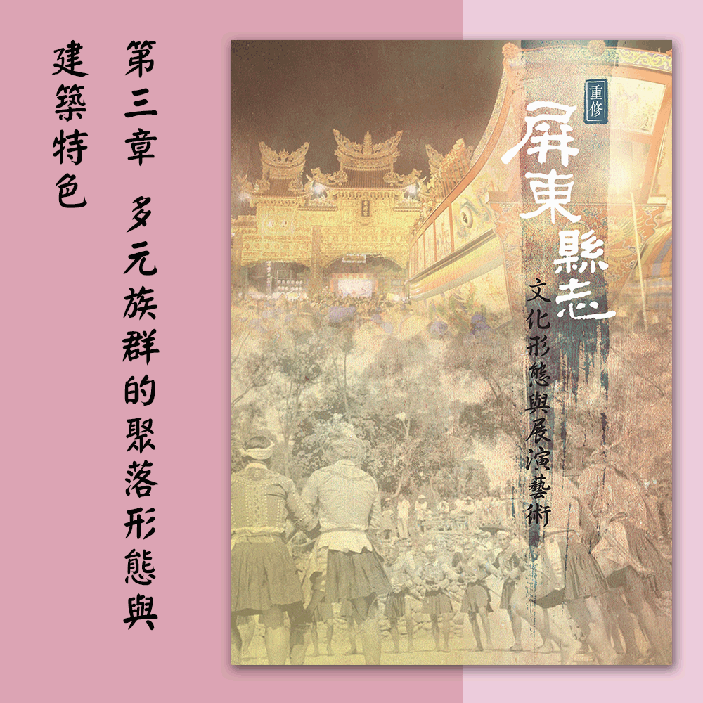 《重修屏東縣志:文化形態與展演藝術》〈第三章 多元族群的聚落形態與建築特色〉出版於2014年11月,由李謁政、陳亮岑撰寫。本文主要介紹多樣性居住形態,所呈現多元族群的聚落文化。首先介紹多元族群的聚落型態,屏東原住民主要有魯凱族部落、排灣族部落和恆春阿美族部落,各自使用特有的構造材料及工法;山腳下稱為鳳山八社的平埔聚落;平原地區以六堆為代表的客家聚落和閩南聚落;國民政府來臺形成的眷村聚落。接著介紹建築材料,呈現在地自然資源和土地關聯,並敘述各族群之建築類型,例如排灣族主屋、附屬屋,青年會所、客家夥房、閩南一條龍、三間起和三合院等不同族群的住屋形態。最後討論工業化和都市化,讓各地域族群文化大量消失的問題。