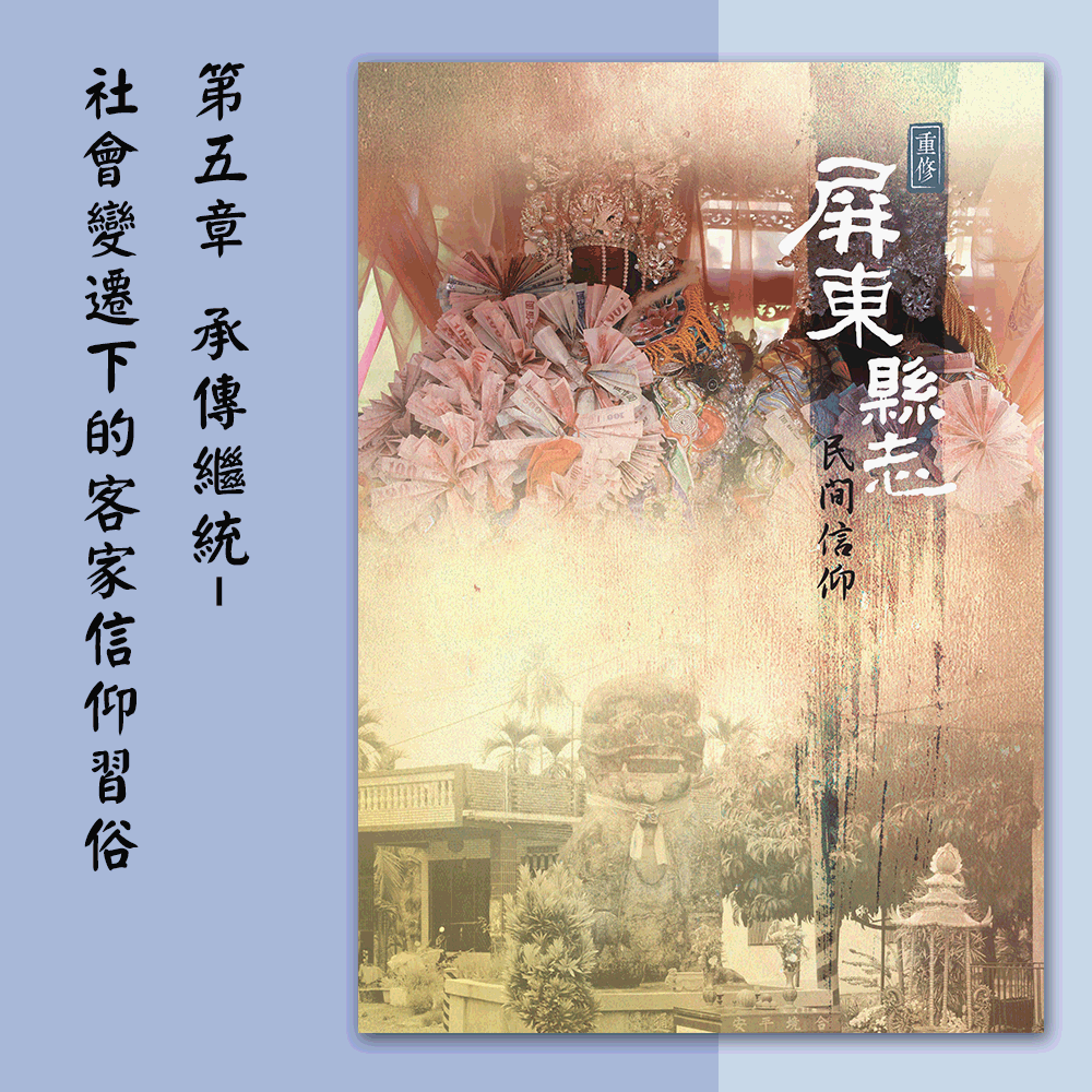 《重修屏東縣志:民間信仰》〈第五章 社會變遷下的客家信仰習俗〉出版於2014年11月,由戴文鋒撰寫。本文主要討論客家信仰習俗在社會環境改變下的變遷。屏東縣的客家地區為高樹、長治、內埔、麟洛、竹田、萬巒、新埤、佳冬8個鄉鎮。客家人自古以來是一個更典型的農耕民族,因為農耕勞動者的種族特性,客家人的文化便呈現出農耕民族典型的保守特性,再加上客家人渡海來臺灣稍遲於河洛人,因此客家村落位置較為內陸,多座落在偏僻的山林之中,地理上的封閉更加深了客家人的保守性。屏東客家地區的信仰行為與生活習俗仍十分具有傳統性,包括惜字敬紙、聖蹟崇拜、重視文運風水、文筆崇拜、扶鸞勸化、土地伯公信仰、強調風水龍脈、敬拜井神、做福還福、強化新丁祭典、舉行敬老長壽宴、渡孤還神、敬天信仰等融入生活作息;而在民間信仰方面,相較河洛人多主祀媽祖、王爺而言,三山國王與神農大帝為屏東客家聚落主流的民間信仰。